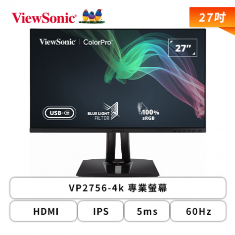 【27型】ViewSonic 優派 VP2756-4k 專業螢幕 (DP/HDMI/Type-C(60W)/IPS/4K/5ms/Delta E < 2/100% sRGB/可升降/可旋轉/內建喇叭/一年無亮點/五年保固)
