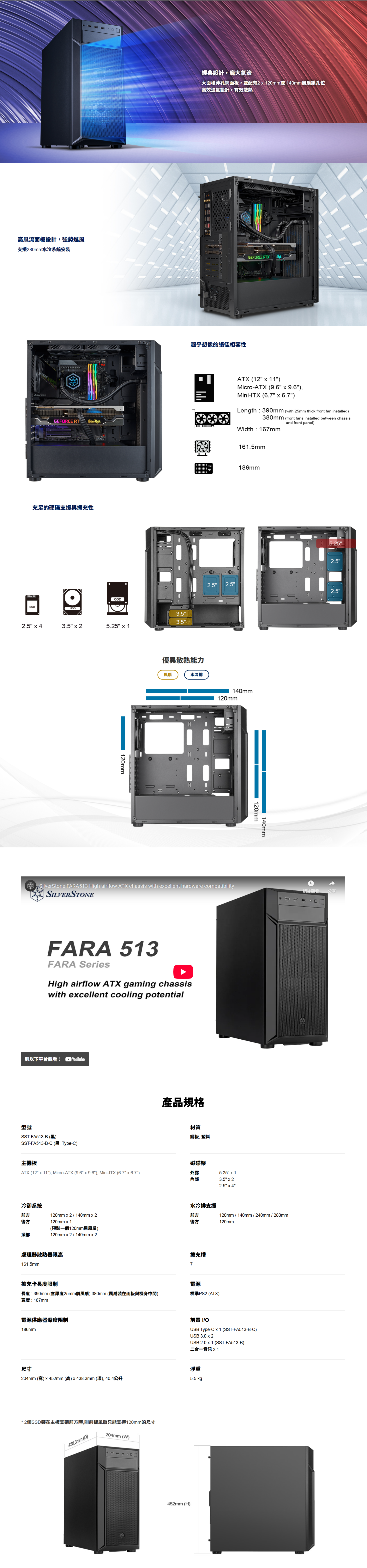 ▶前置I/O介面包含USB Type-C x 1, USB 3.0 x 2、二合一音訊 x 1 (SST-FA513-B-C)