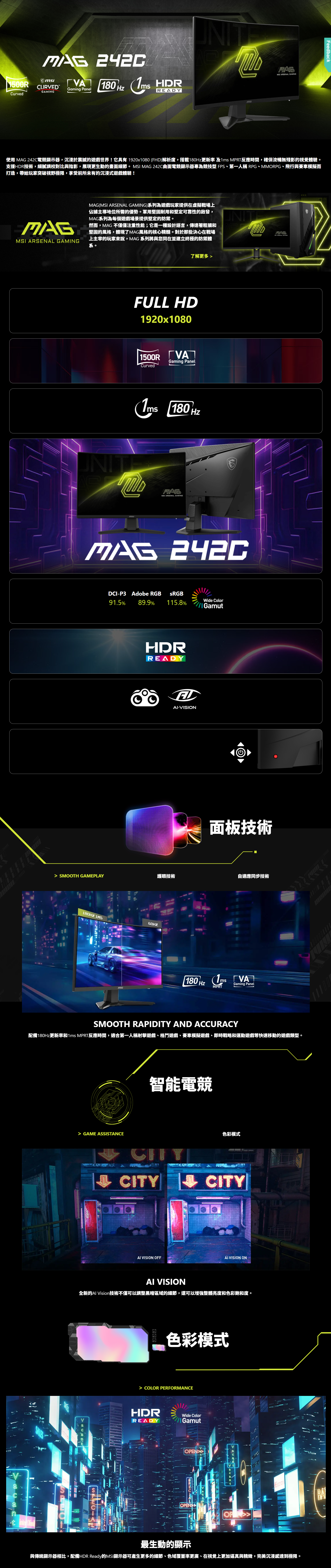 VA 面板 - 提供 1ms(MPRT)反應時間,優化螢幕色彩和亮度