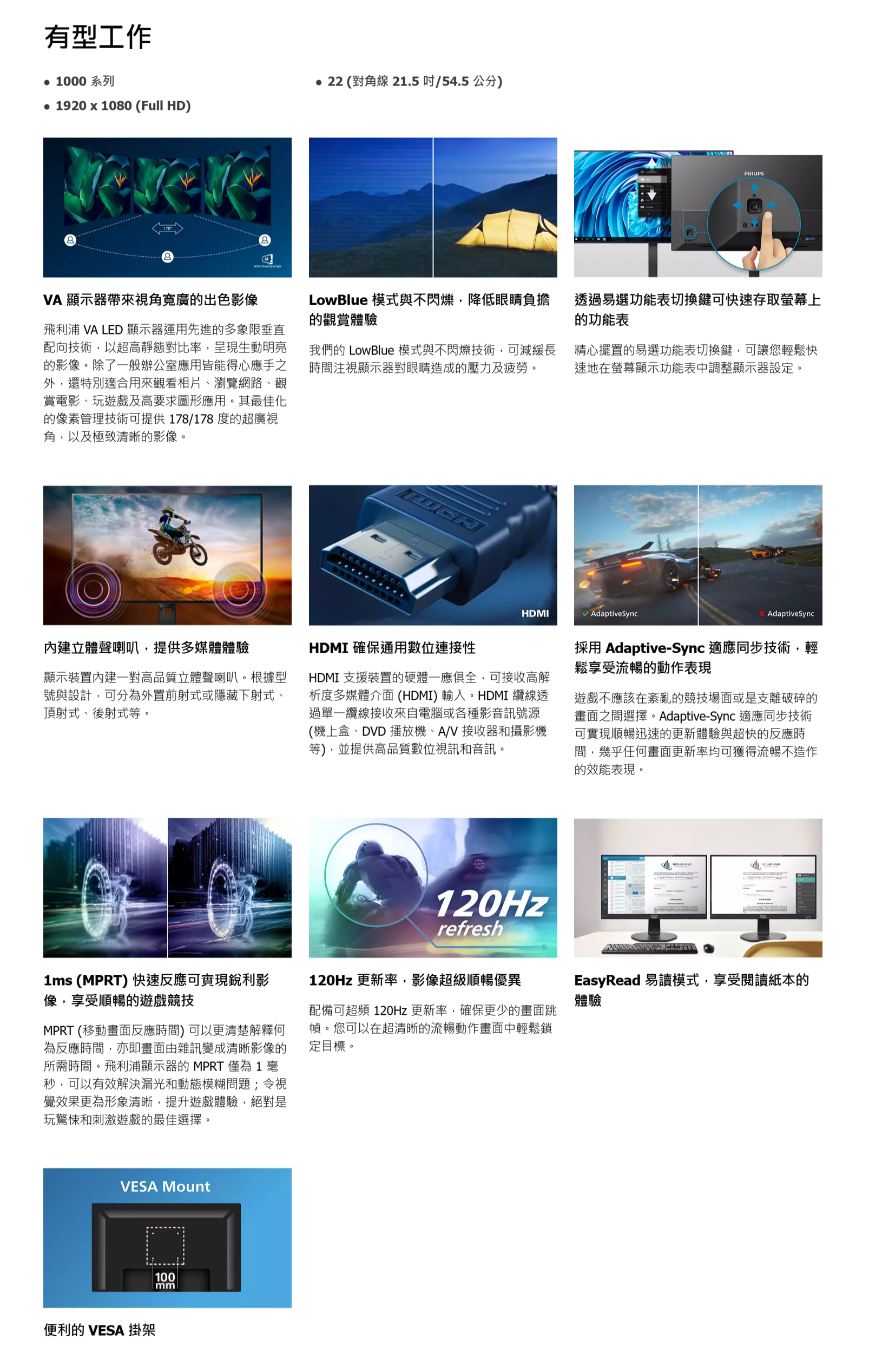 - LowBlue 模式與不閃爍,降低眼睛負擔的觀賞體驗