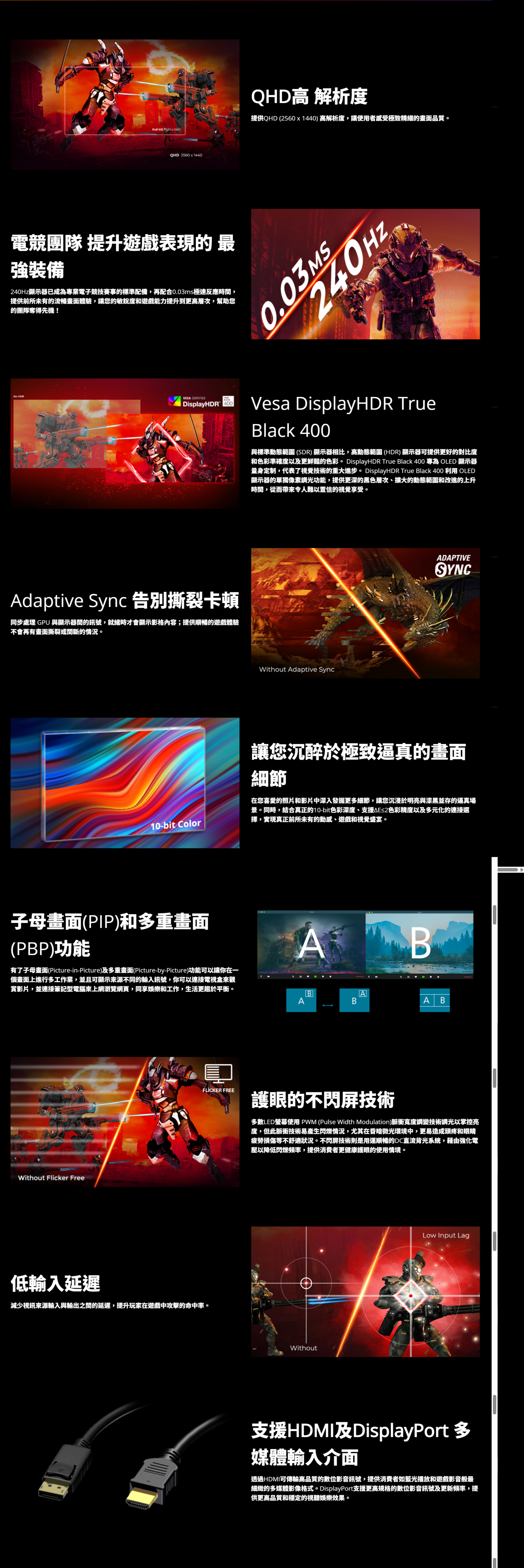 最佳解析度 2560 × 1440 @ 240Hz ‒ DisplayPort1.4; 2560 × 1440 @ 144Hz ‒ HDMI2.0