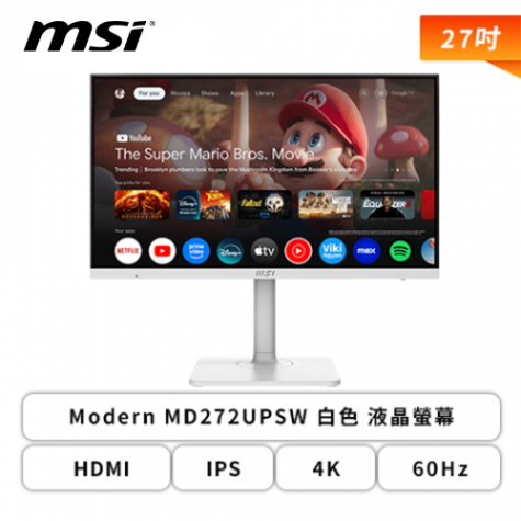 【27型】MSI Modern MD272UPSW 白色 液晶螢幕 (DP/HDMI/Type-C(65W)/IPS/4K/Dolby Audio/Google TV™智慧顯示器/可升降/可旋轉/防閃爍/低藍光/內建喇叭/三年保固)