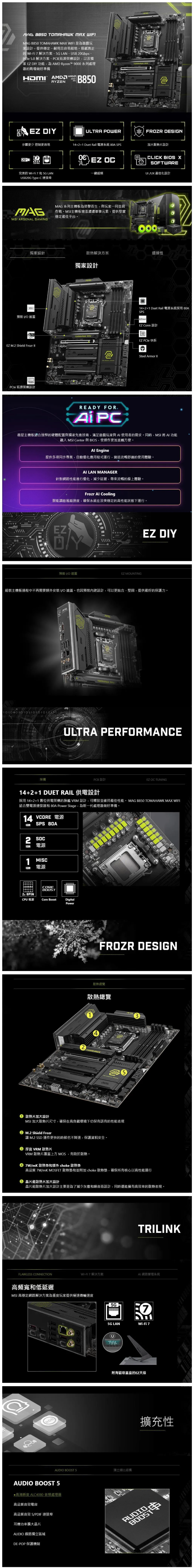 微星 MAG B850 TOMAHAWK MAX WIFI (ATX/1H/Realtek 5G/Wi-Fi 7+BT 5.4/註冊五年保) 14+2+1相供電