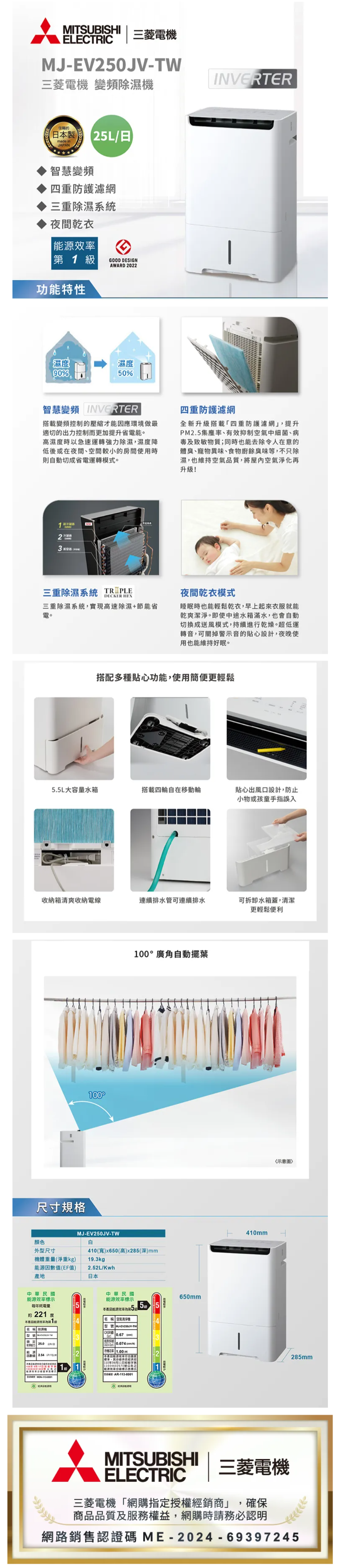 MITSUBISHI 三菱 25公升 日本製 變頻除濕機 MJ-EV250JV-TW