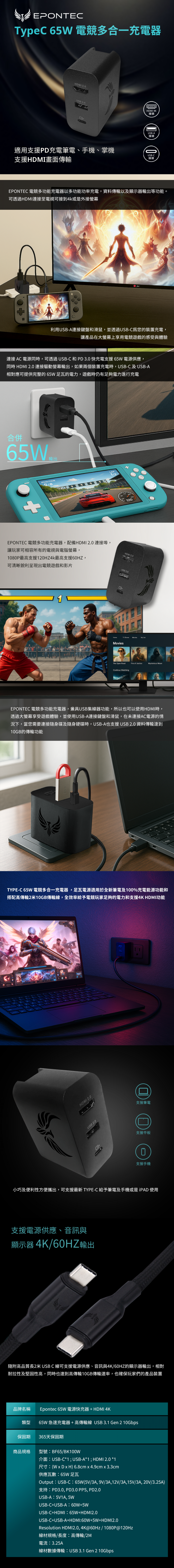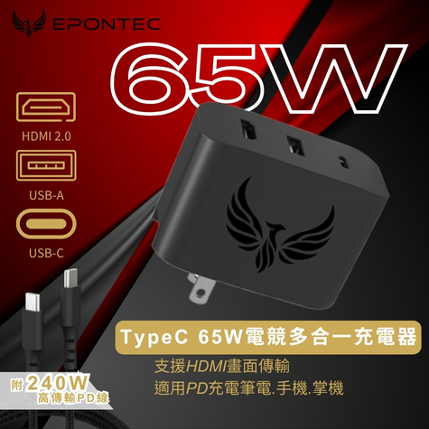 EPONTEC TypeC 65W電競多合一充電器 / 支援HDMI畫面傳輸 / HDMI*1、USB*1、TypeC*1 / 內附240W高傳輸PD線 / 適用支援PD充電筆電.手機.掌機