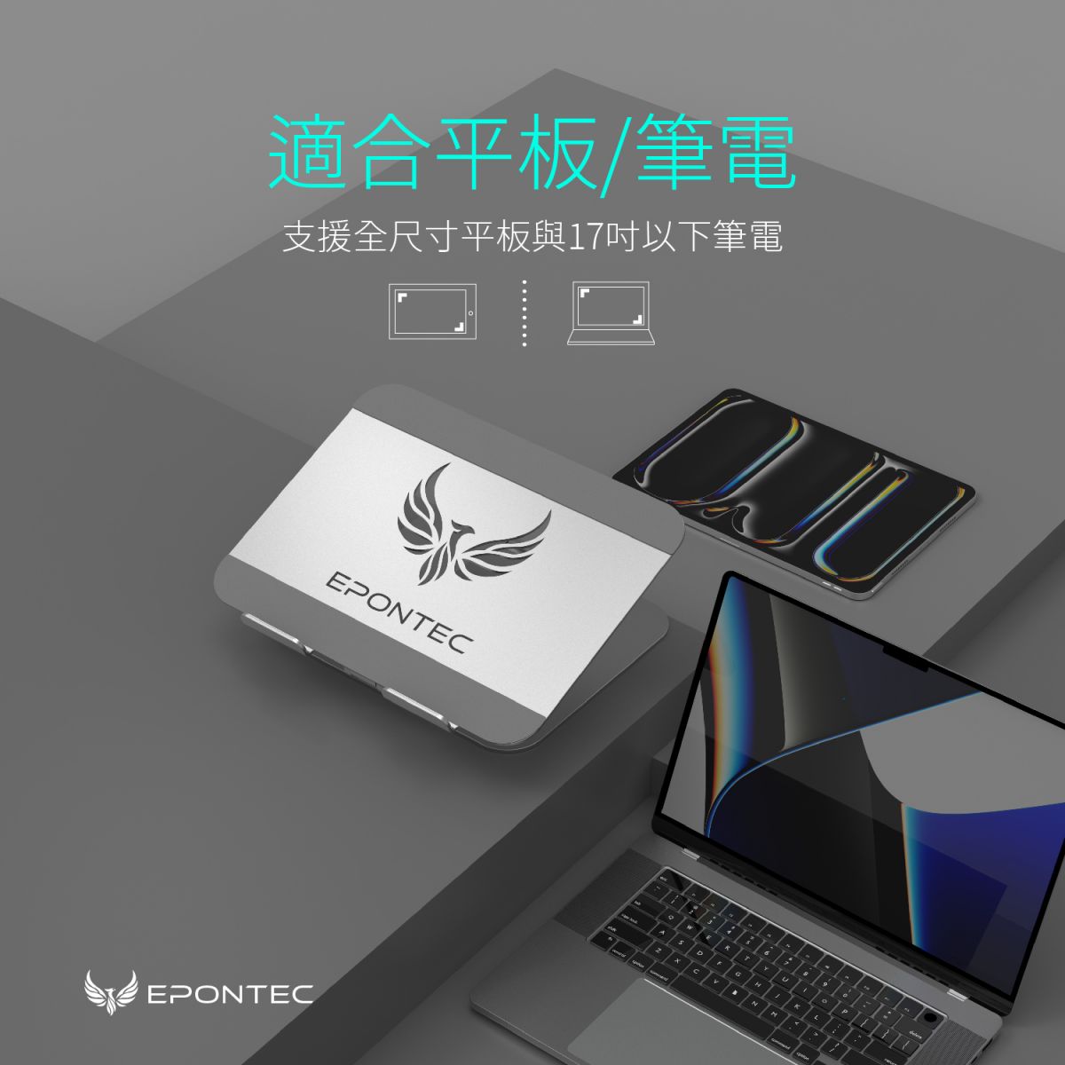 - 支援全尺寸平板及17吋以下筆電