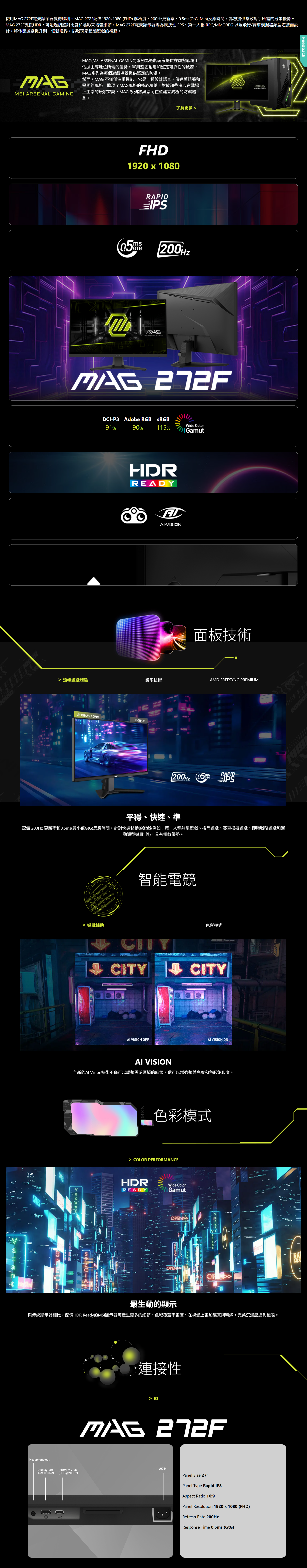 Rapid IPS 面板-提供 0.5ms(GtG,最小值)快速反應時間,優化螢幕顏色和亮度