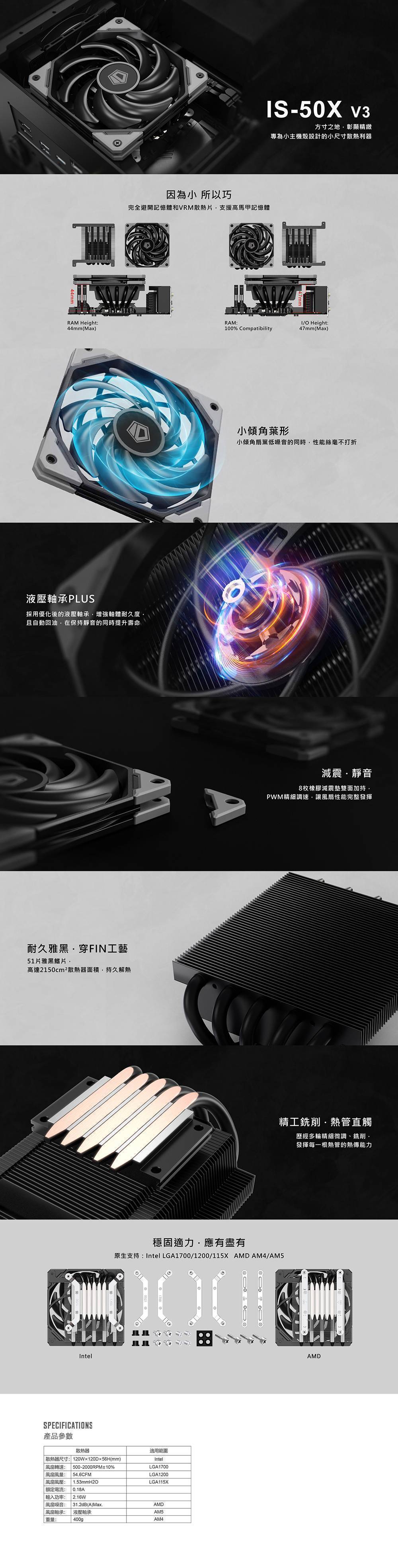 ID-COOLING IS-50X V3 下吹式散熱器 (5導管/黑化版/12cm風扇*1/高55mm)