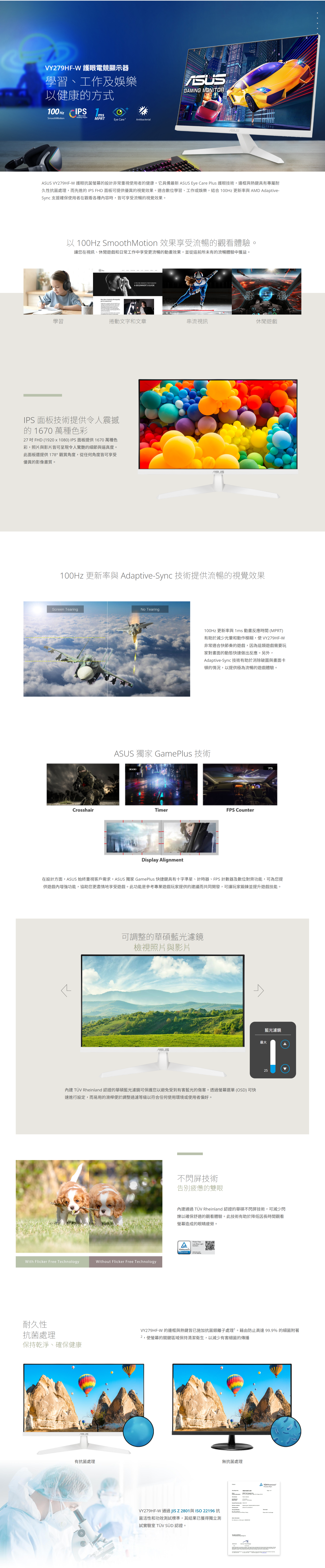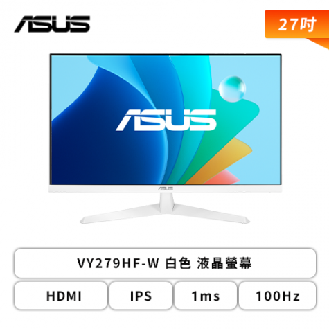 【27型】華碩 VY279HF-W 白色 液晶螢幕 (HDMI/IPS/1ms/100Hz/Adaptive Sync/不閃屏/低藍光/無喇叭/三年保固)