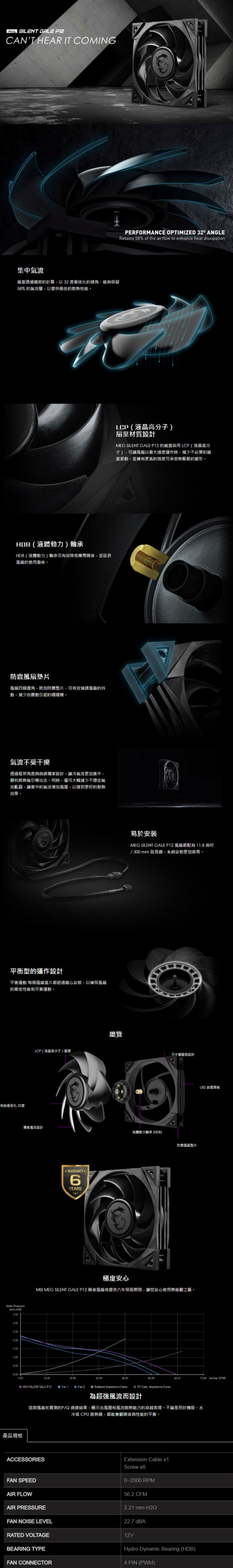 ▶MEG SILENT GALE P12 的扇葉採用 LCP(液晶高分子),可讓風扇以最大速度運作時,減少不必要的扇葉振動,並擁有更高的強度可承受熱膨脹的變形。