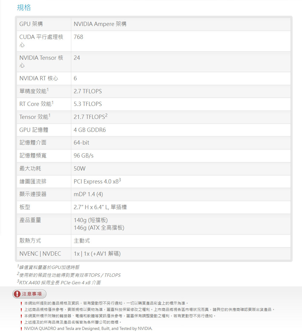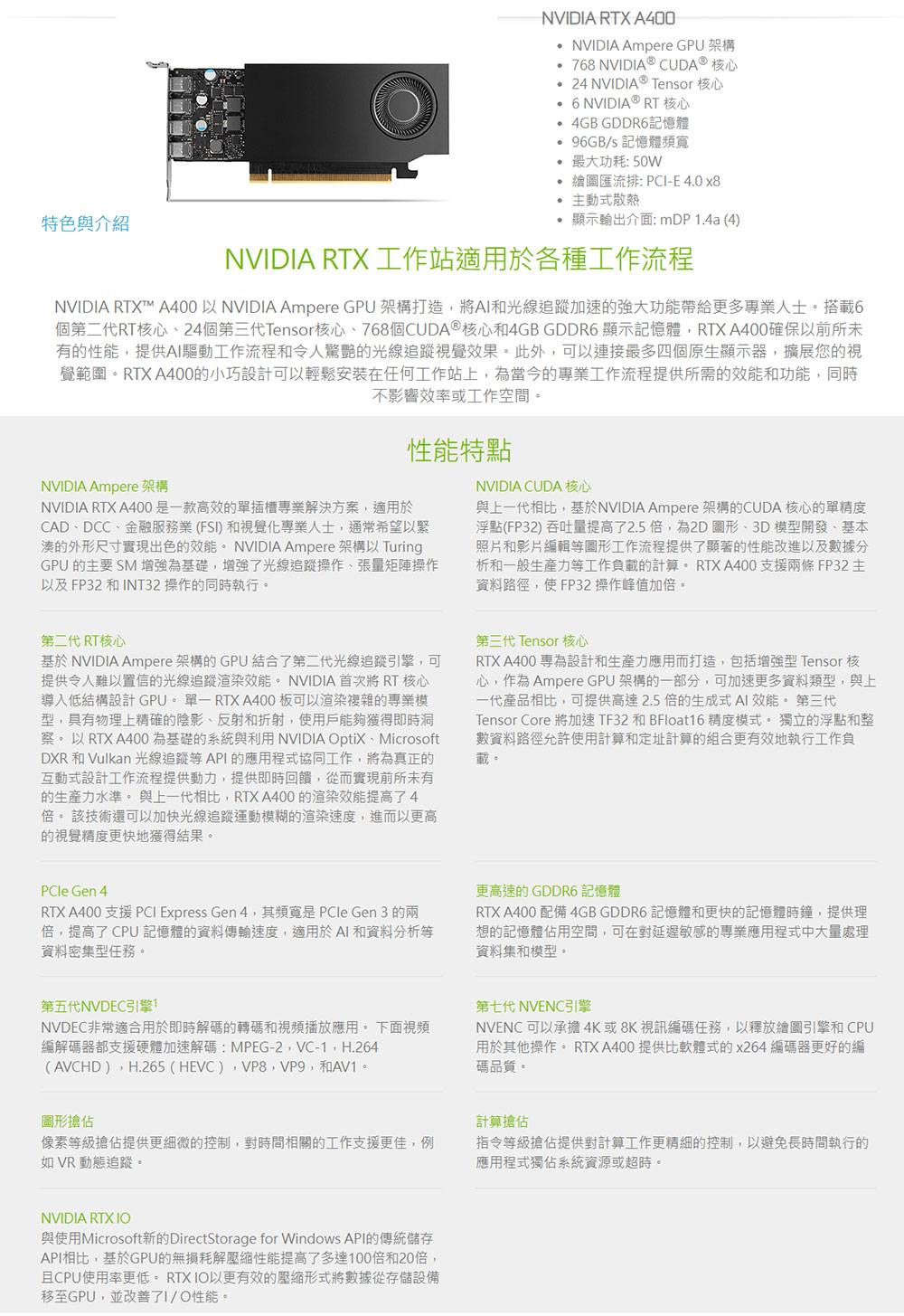 麗臺 NVIDIA RTX A400 工作站繪圖卡(4GB GDDR6/CUDA:768/64bit/16.26cm)