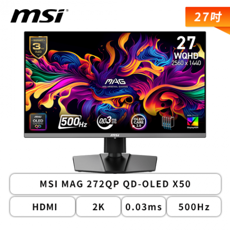 【27型】MSI MAG 272QP QD-OLED X50 電競螢幕 (DP/HDMI/Type-C/QD-OLED/2K/0.03ms/500Hz/Adaptive Sync/HDR BLACK 500/ClearMR 21000/AI VISION/可升降/可旋轉/無喇叭/三年保固)