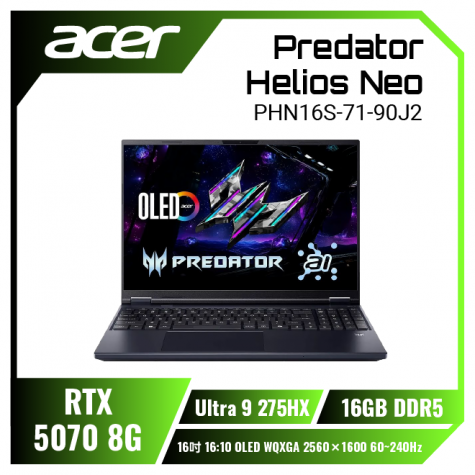 acer Predator Helios Neo PHN16S-71-90J2 宏碁掠奪者冷競特攻電競筆電/Ultra 9-275HX/RTX5070 8G/16GB DDR5/512GB PCIe/16吋 16:10 2.5K 240Hz OLED/W11