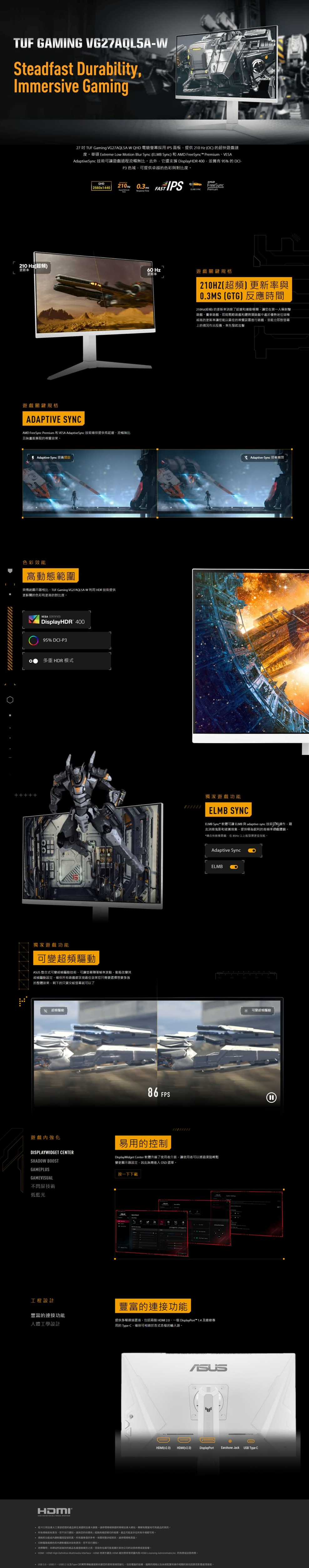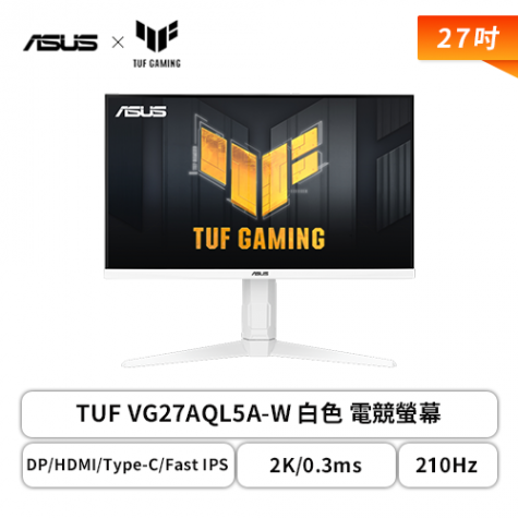 【27型】華碩 TUF VG27AQL5A-W 白色 電競螢幕 (DP/HDMI/Type-C/Fast IPS/2K/0.3ms/210Hz/Freesync Premium/G-Sync/HDR400/可變超頻驅動/130% sRGB/可升降/可旋轉/內建喇叭/三年保固)