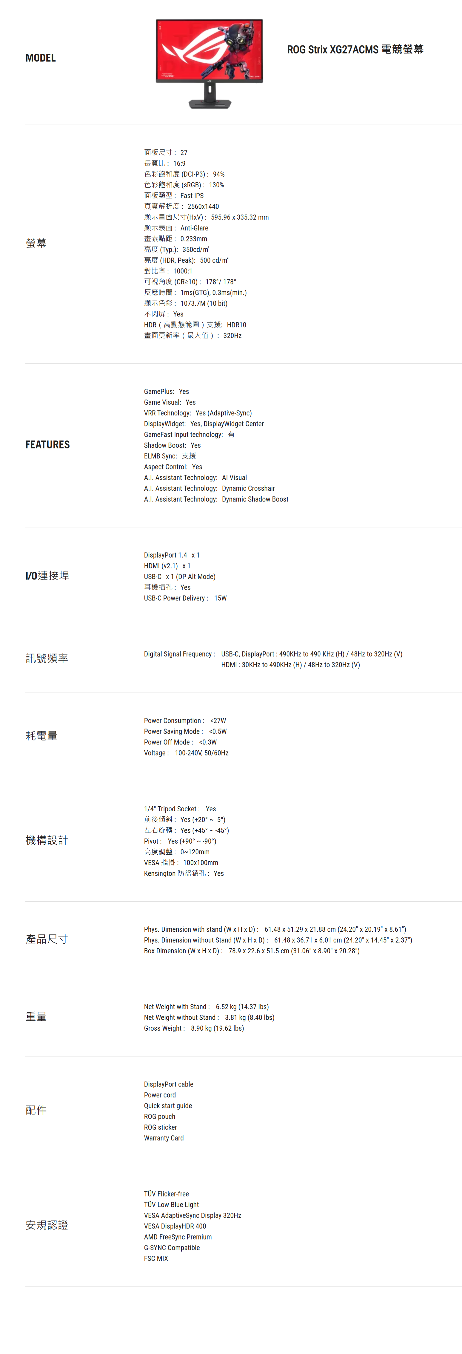 - 27 吋 2560 x 1440 HDR 電競螢幕,搭載極快 320Hz (超頻) 更新率,專為職業玩家和沉浸式遊戲所設計。