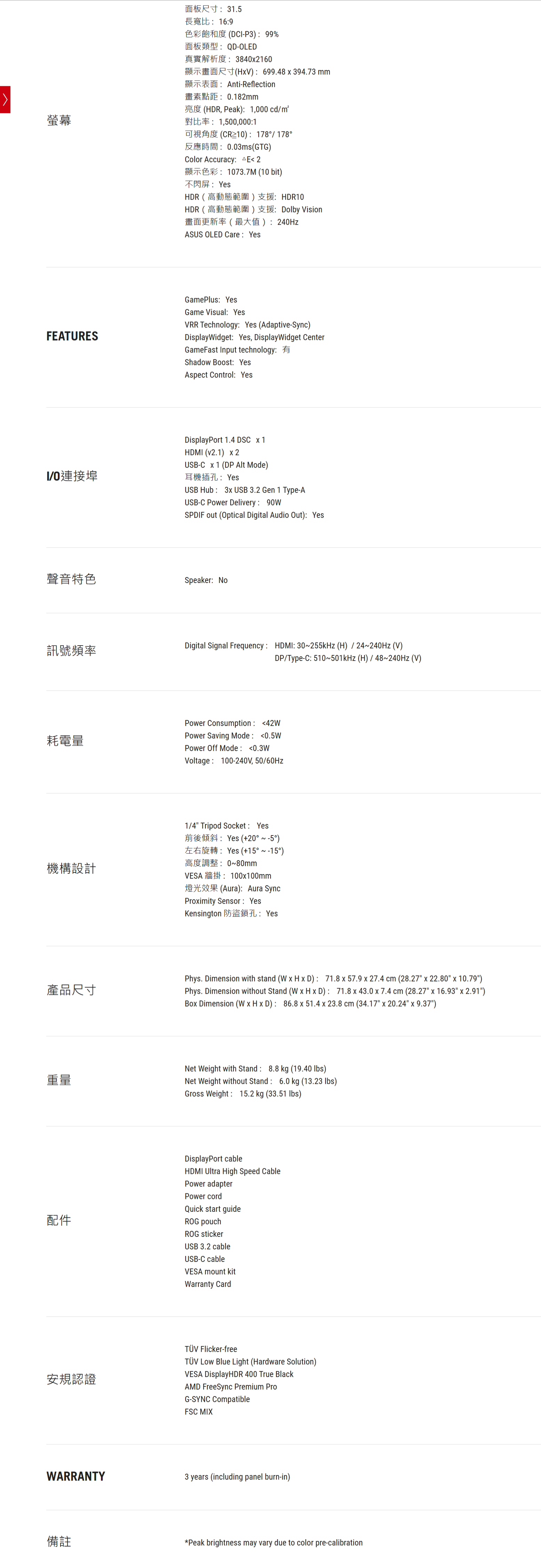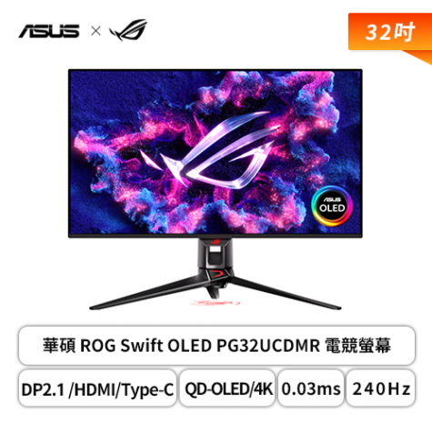【32型】華碩 ROG Swift OLED PG32UCDMR 電競螢幕 (DP2.1 UHBR20/HDMI/Type-C(90W)/QD-OLED/4K/0.03ms/240Hz/FreeSync Premium Pro/G-SYNC/HDR400/DELTA E < 2/KVM/ROG 燈光投影/可升降/無喇叭/三年保固)