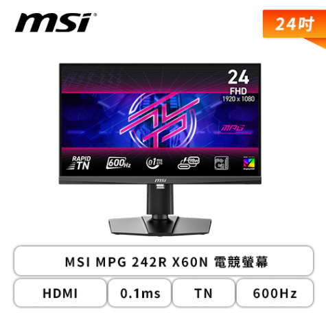 【24型】MSI MPG 242R X60N 電競螢幕 (DP/HDMI*2/Type-C(98W)/TN/FHD/0.1ms/600HZ/AMD FreeSync™ Premium/HDR 400/無喇叭/三年保固)
