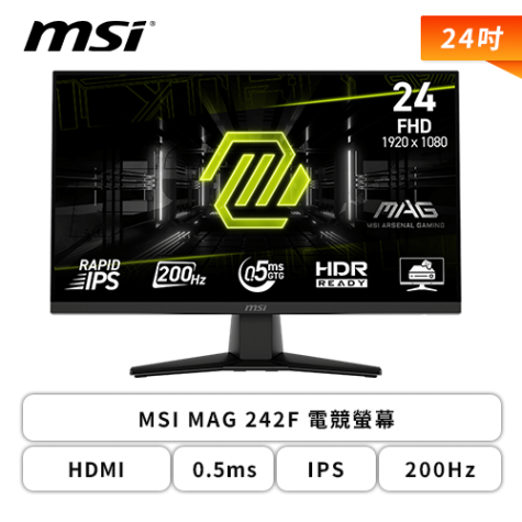 【24型】MSI MAG 242F 電競螢幕 (DP/HDMI/Rapid IPS/0.5ms/200Hz/FreeSync Premium/HDR READY/無喇叭/三年保固)