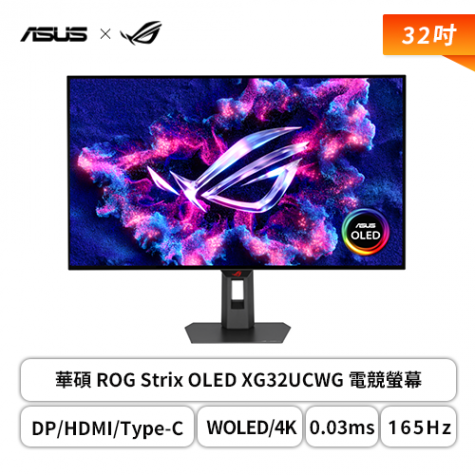 【32型】華碩 ROG Strix OLED XG32UCWG 電競螢幕 (DP/HDMI/Type-C/WOLED/4K/0.03ms/165Hz(FHD320Hz)/FreeSync Premium/G-Sync/HDR400/DELTA E < 2/Neo 近接感測器/可升降/無喇叭/三年保固)