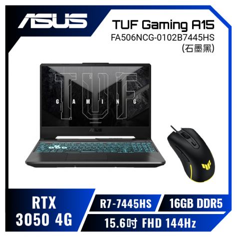 ASUS TUF Gaming A15 FA506NCG-0102B7445HS 石墨黑 華碩軍規電競筆電/R7-7445HS/RTX3050 4G/16GB DDR5/512GB PCIe/15.6吋 FHD 144Hz/W11/含TUF電競滑鼠