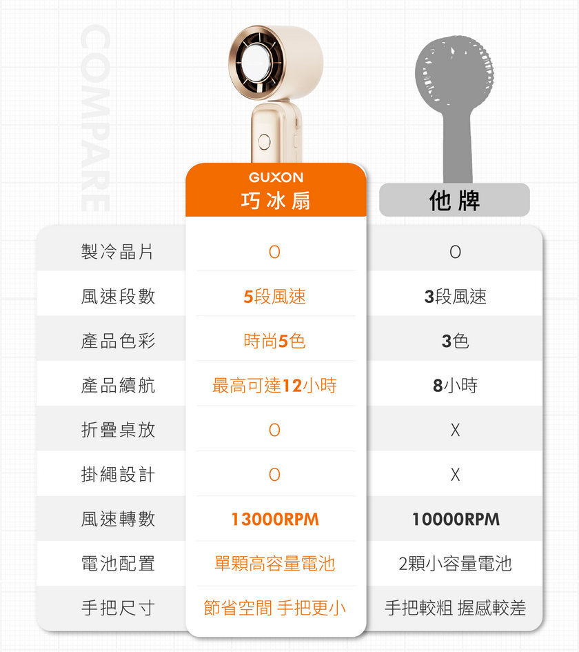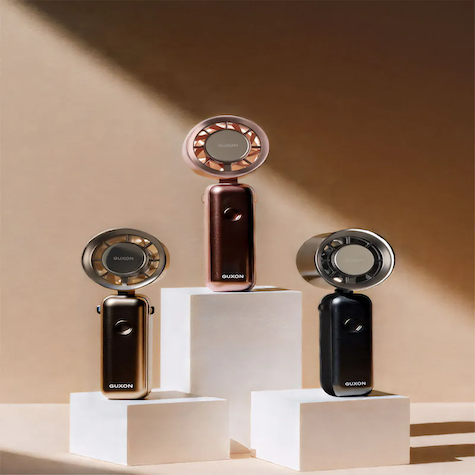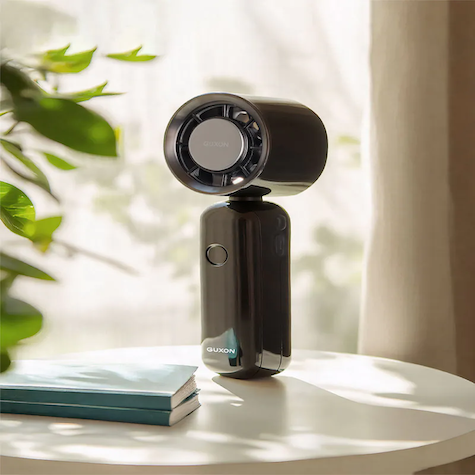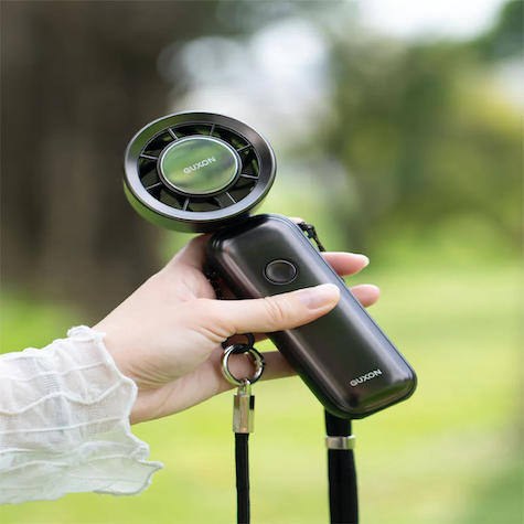 GUXON 巧冰扇,結合「五段風速+製冷片」雙涼感技術,隨身手持、掛脖、桌立三用設計,輕巧收折不卡包,露營、登山、通勤一路涼爽同行。