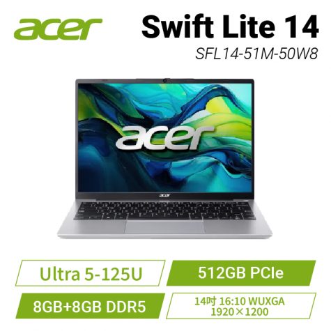 acer Swift Lite SFL14-51M-50W8 銀 宏碁時尚輕纖筆電/Ultra 5-125U/16GB DDR5/512GB PCIe/14吋 16:10 FHD+/W11