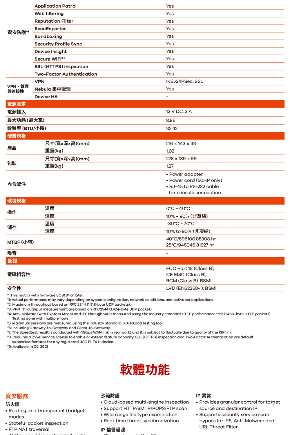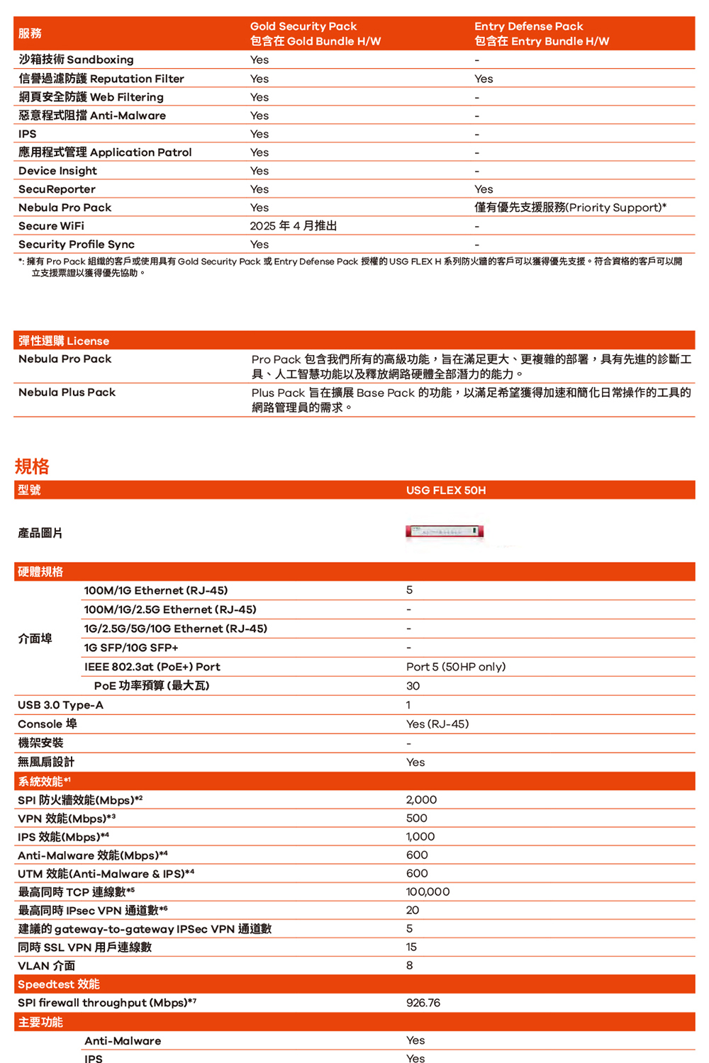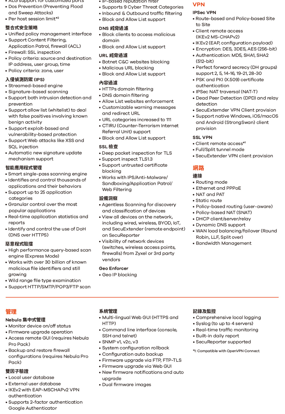 - IPS 吞吐量可達 1 Gbps,Anti-virus 吞吐量可達 600 Mbps,AV+IPS 吞吐量可達 600 Mbps。(需另購 Gold 資安軟體更新授權)