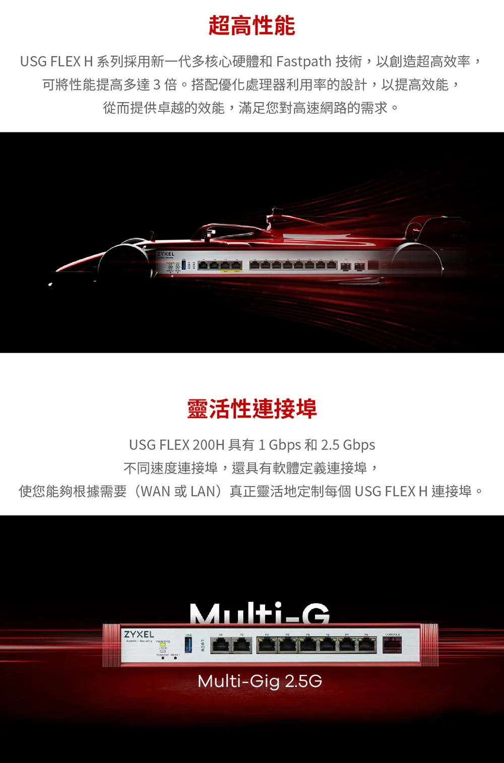 - 內建 6 個 10/100/1000 Mbps RJ-45 可設定埠及2 個 2.5G 埠