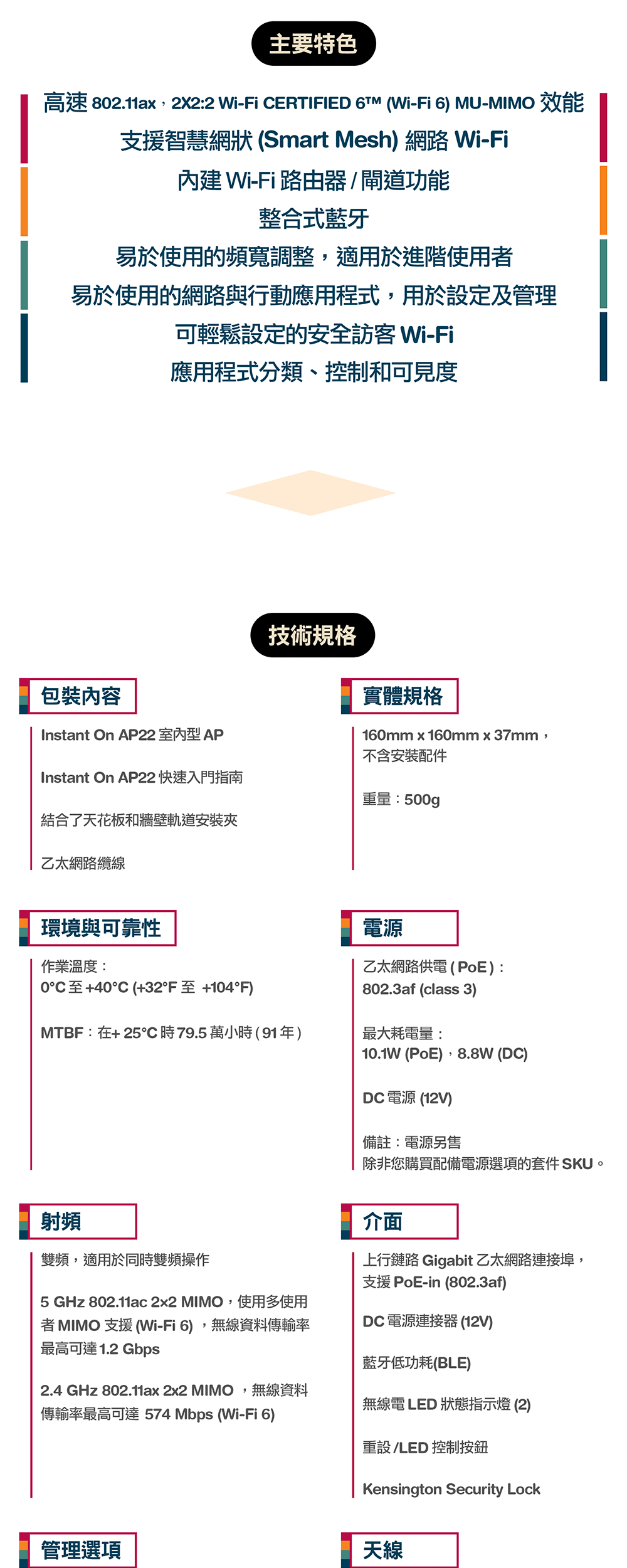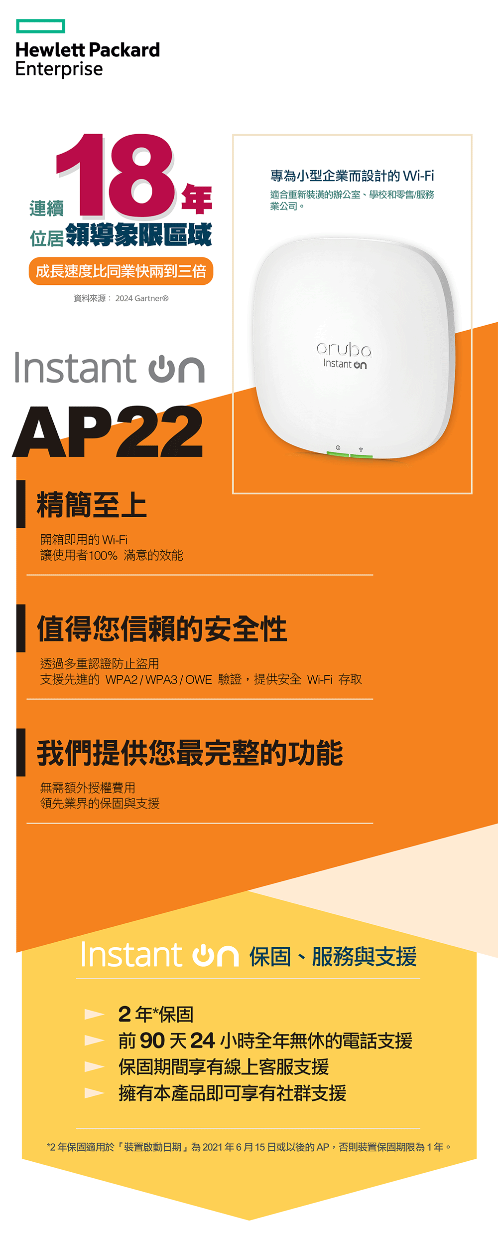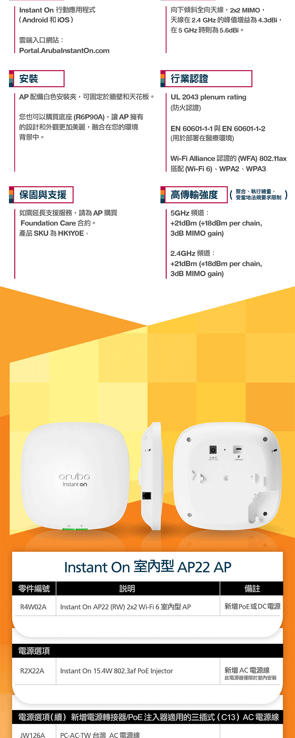Aruba HPE Networking Instant On AP22 商用無線網路基地台/室內型/雙頻/Wi-Fi6 (R4W02A)