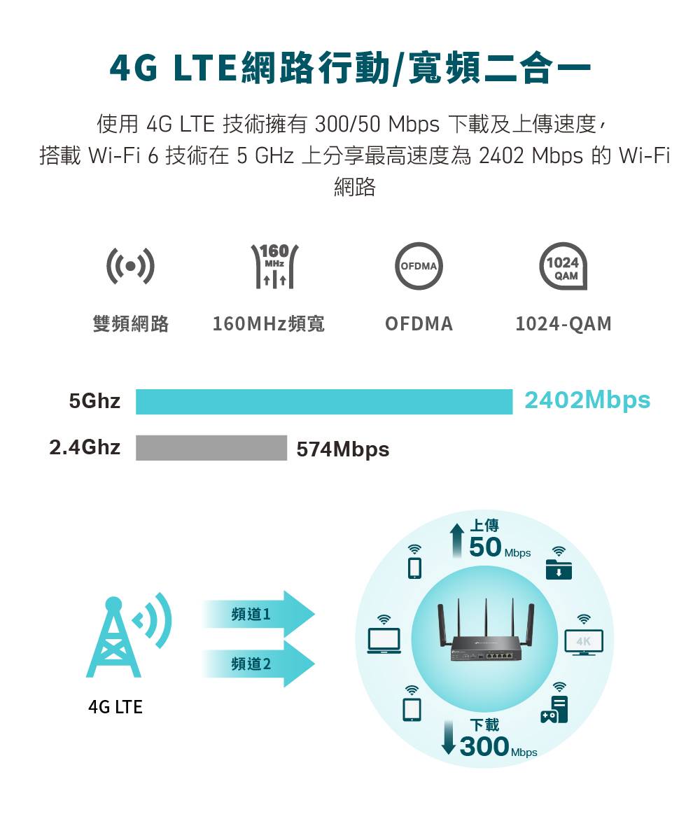 - AX3000 雙頻 Wi-Fi 6,5GHz 可達 2402Mbps,2.4GHz 可達 574Mbps***