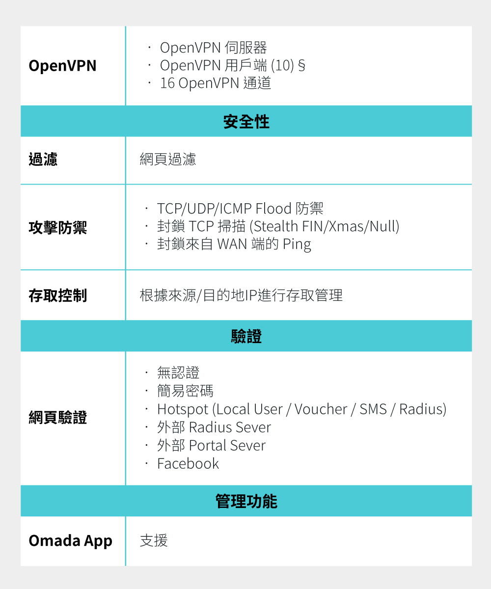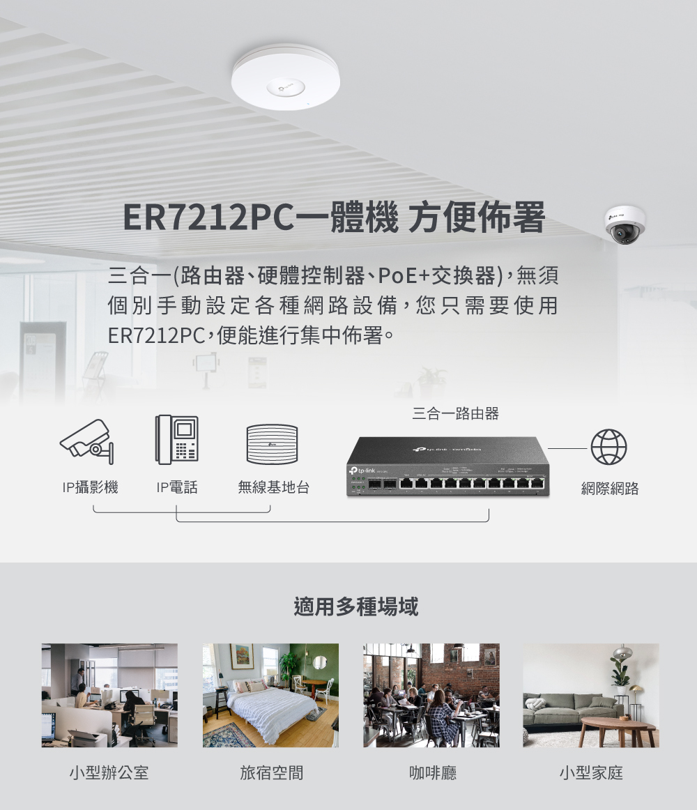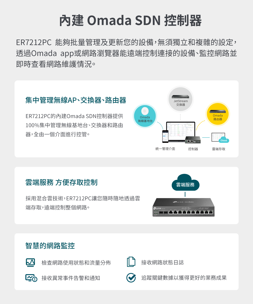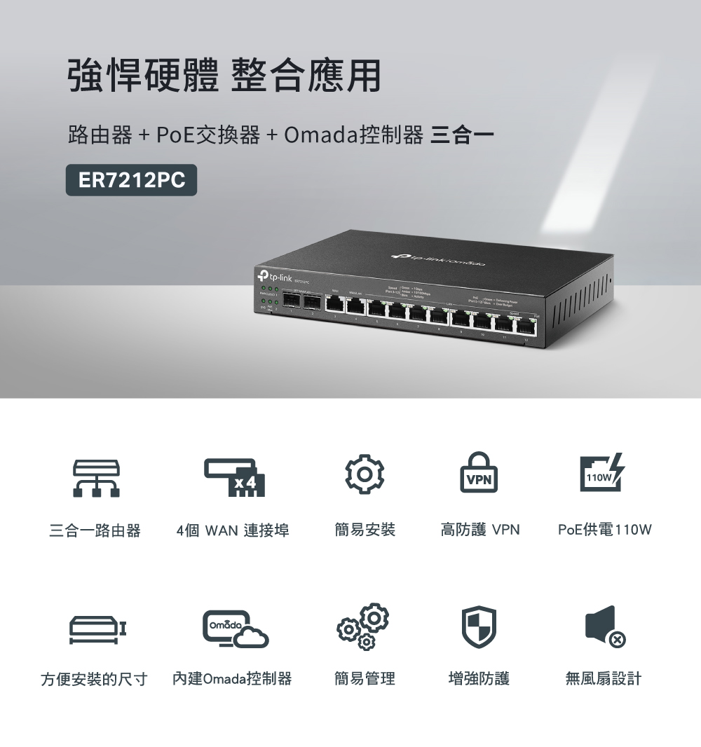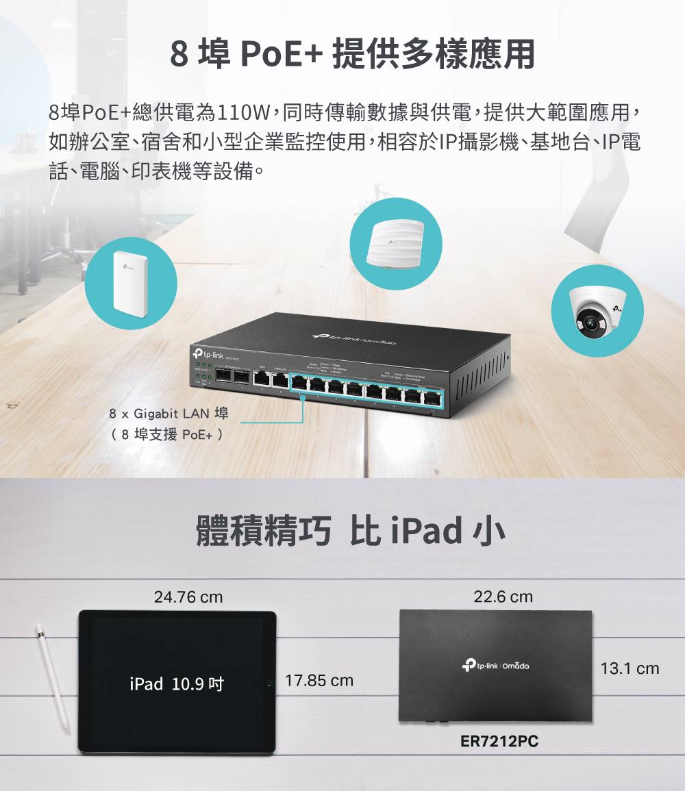 - 三合一路由器:集路由器、PoE 交換器和 Omada 控制器功能為一身,最多可管理 10 台EAP。