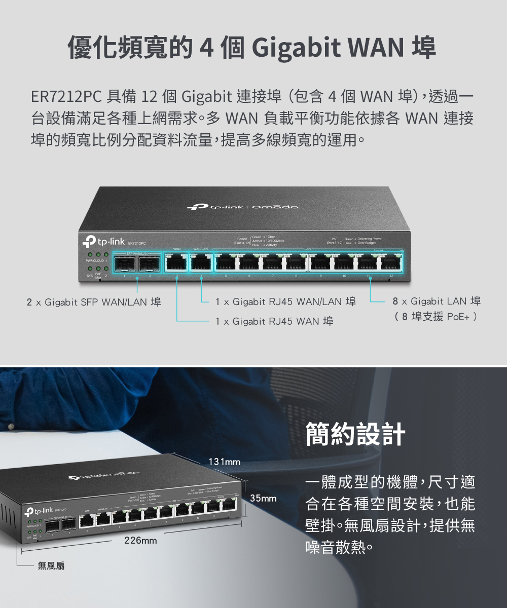 - 高達 4 個 WAN 連接埠:具備兩個 Gigabit SFP WAN/LAN 連接埠、一個 Gigabit RJ45 WAN 連接埠以及一個 Gigabit RJ45 WAN/LAN 連接埠。