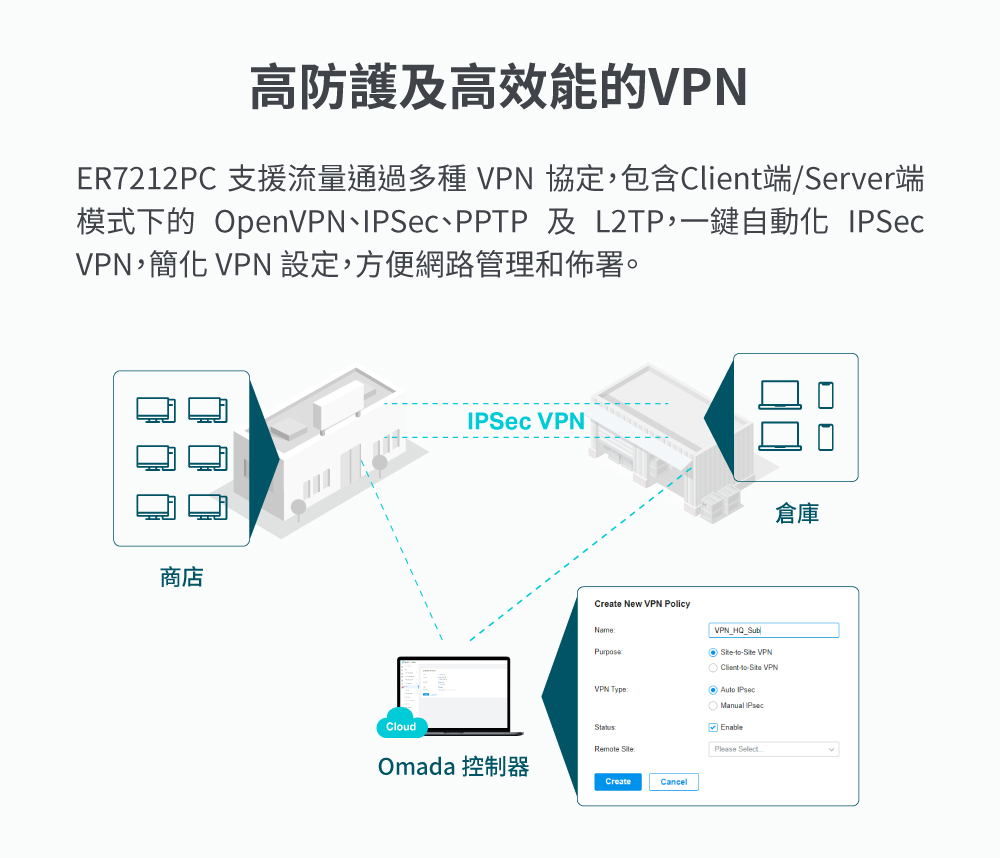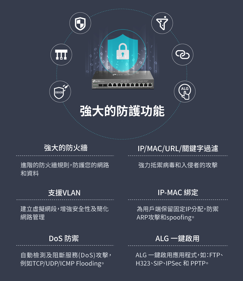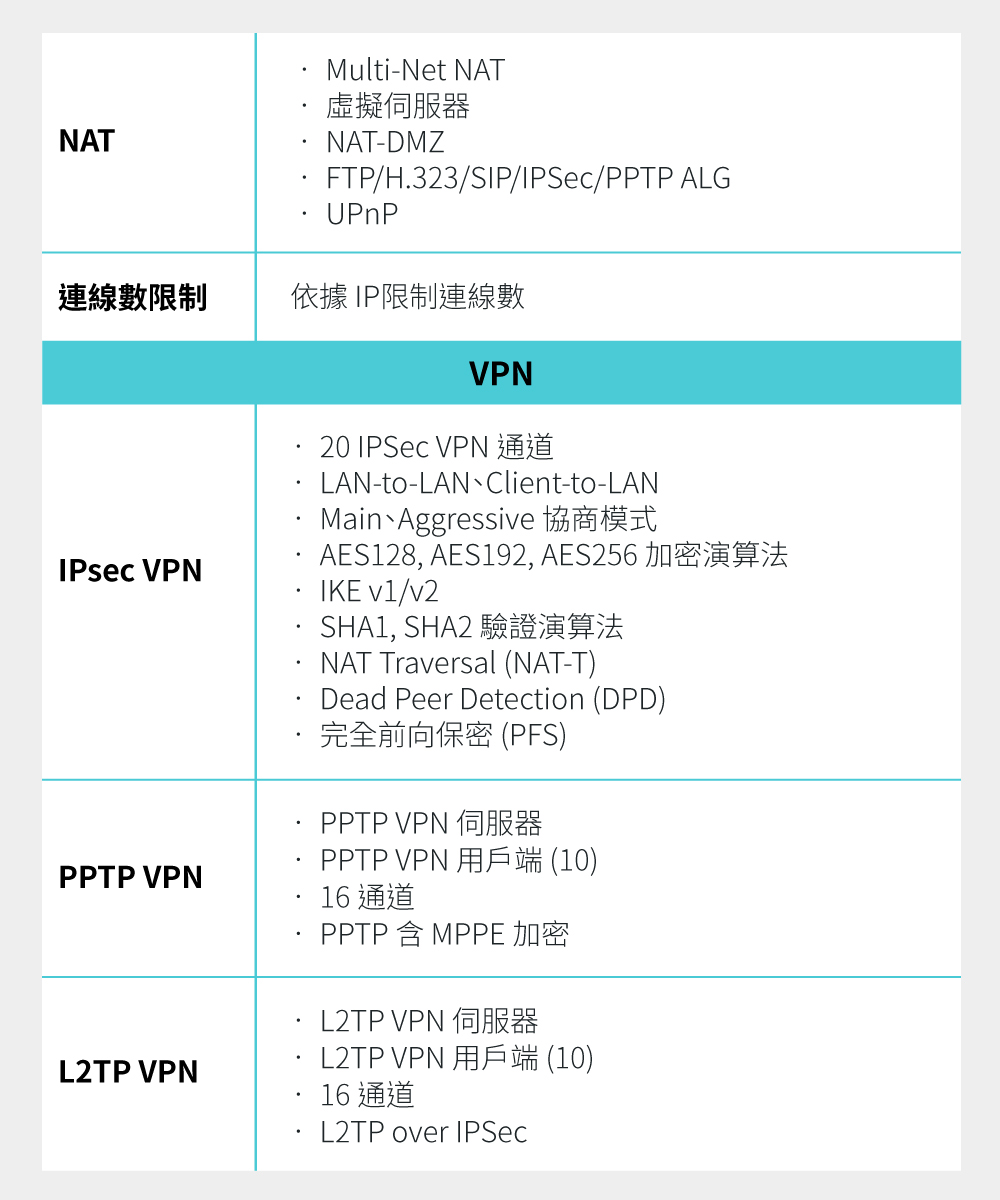 - 高度防護的 VPN: 支援IPsec VPN、OpenVPN 以及 L2TP/PPTP VPN 連接。