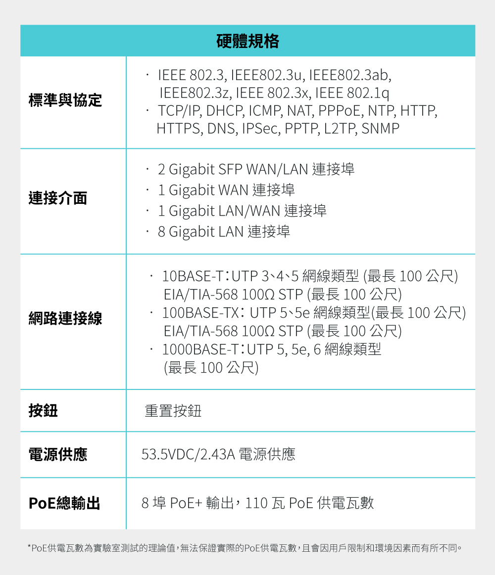 - 110 瓦 PoE 供電:8 個 802.3at/af 相容的 PoE+ RJ45 LAN 總供電支援 110 瓦。
