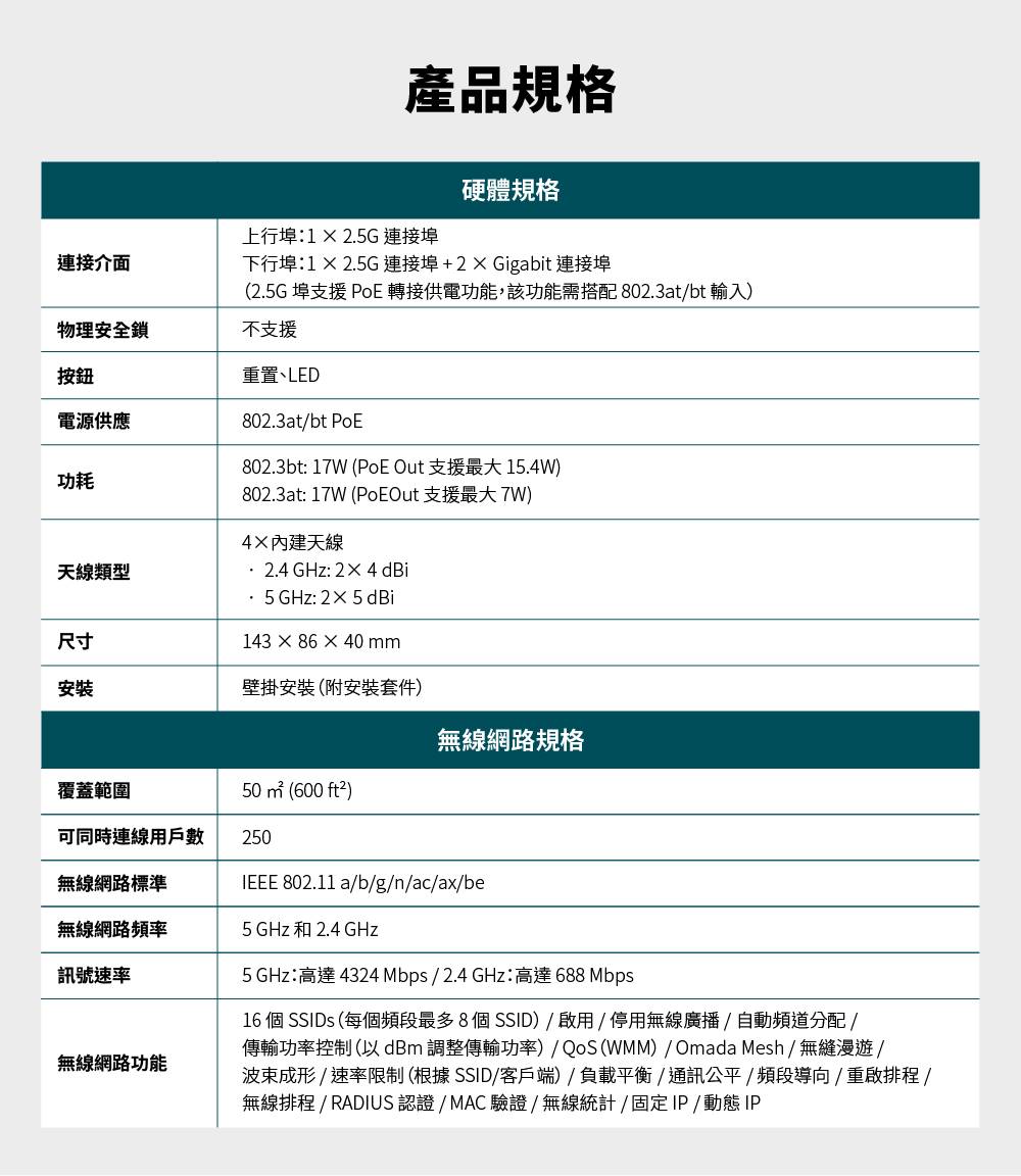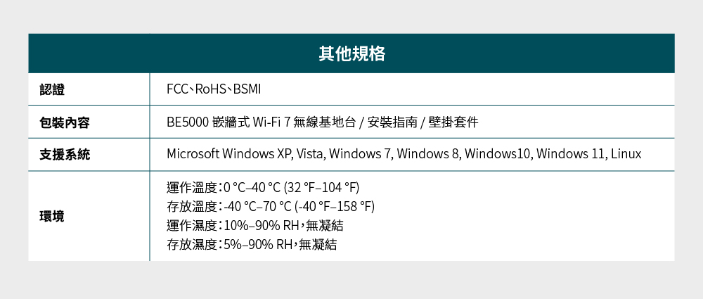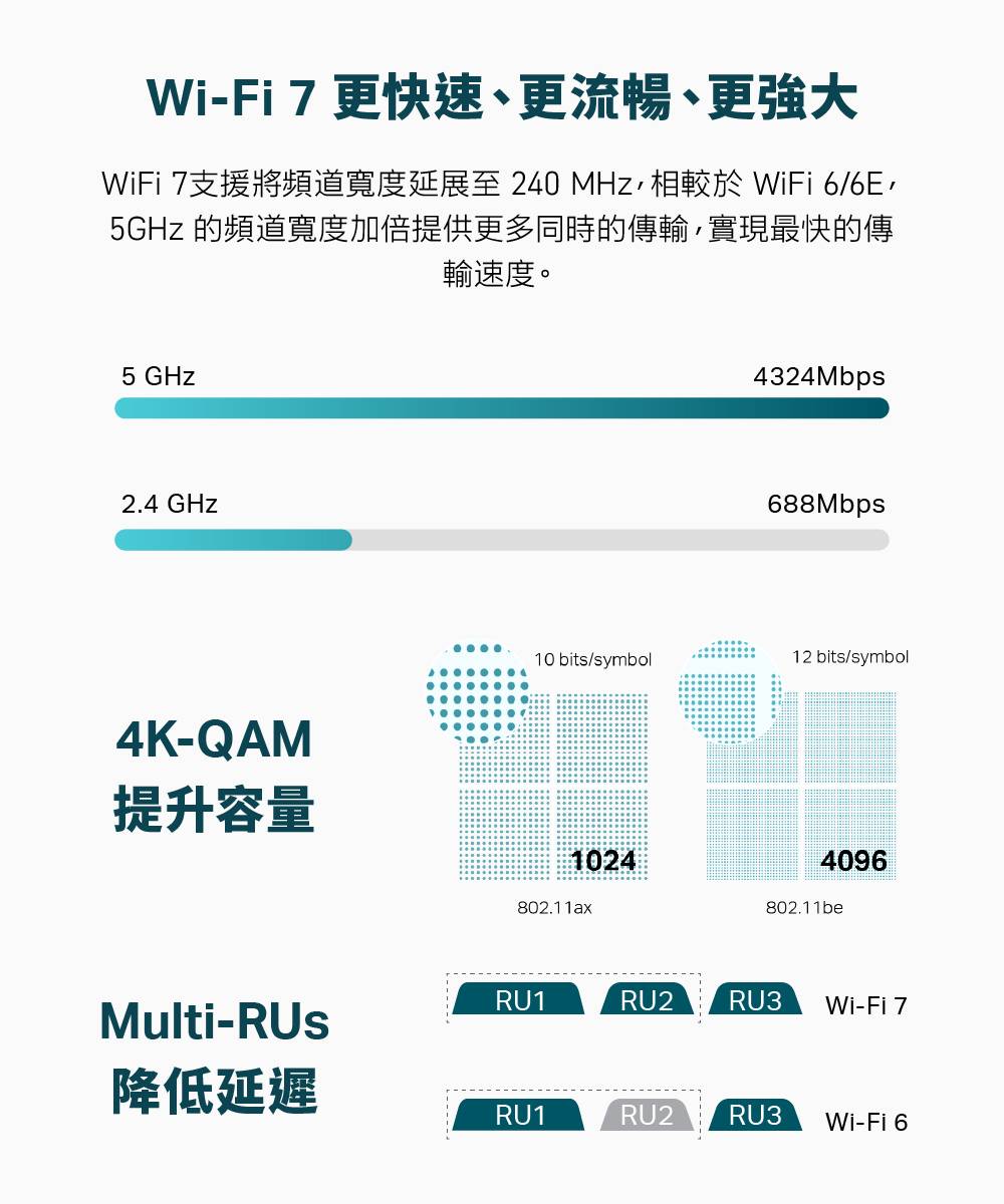 - BE5000 Wi-Fi 7 (5 GHz 頻段 4324 Mbps + 2.4 GHz 頻段 688 Mbps)