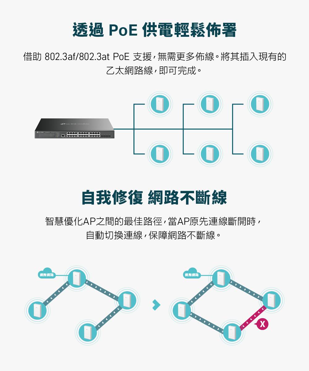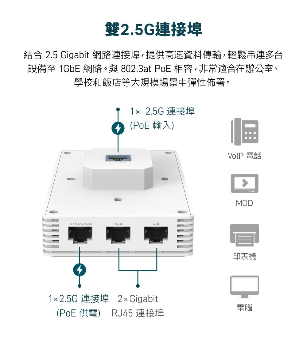 - 1個2.5G PoE 輸入埠、1個2.5G透通埠、2個Gigabit RJ45 下行埠