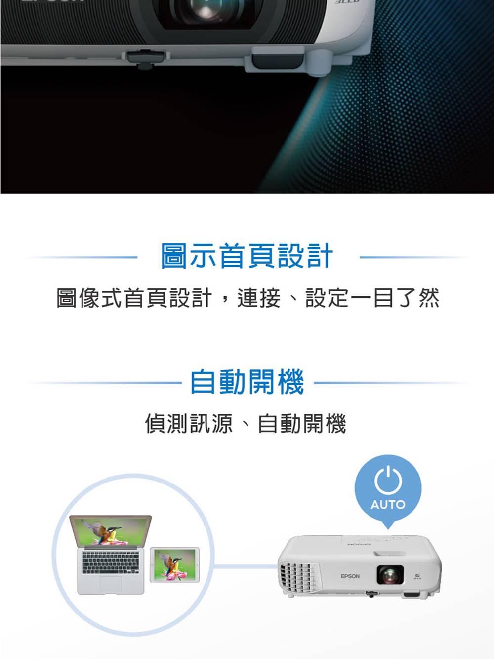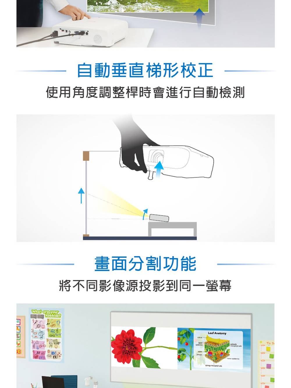 • 支援自動±30度垂直,手動±30度水平梯形修正,並支援自動開機功能