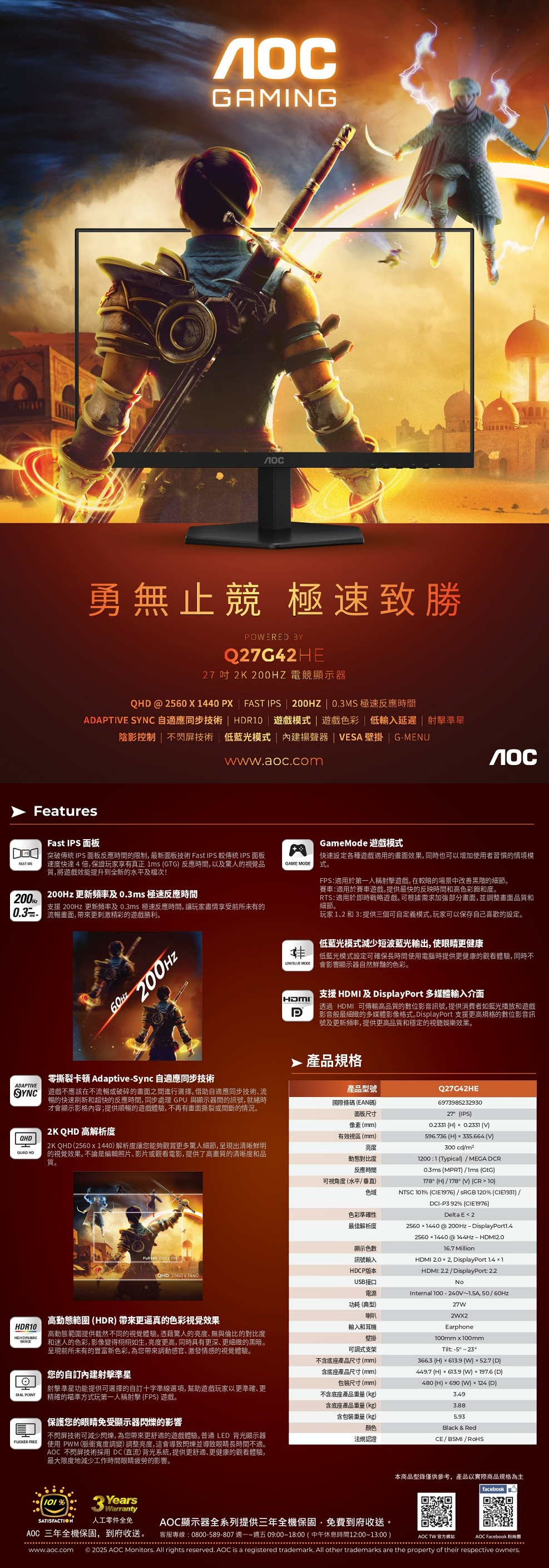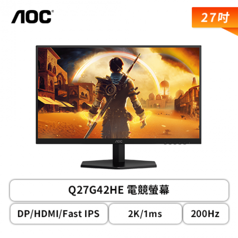 【27型】AOC Q27G42HE 電競螢幕 (DP/HDMI/Fast IPS/2K/1ms/200Hz/Adaptive Sync/HDR10/內建喇叭/三年保固)