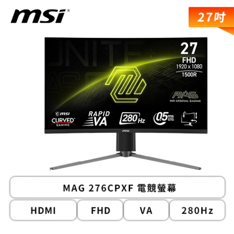 【27型】MSI MAG 276CPXF 電競螢幕 (DP/HDMI/Rapid VA/曲面/0.5ms/280Hz/Adaptive-Sync/HDR READY/無喇叭/升降腳/三年保固)