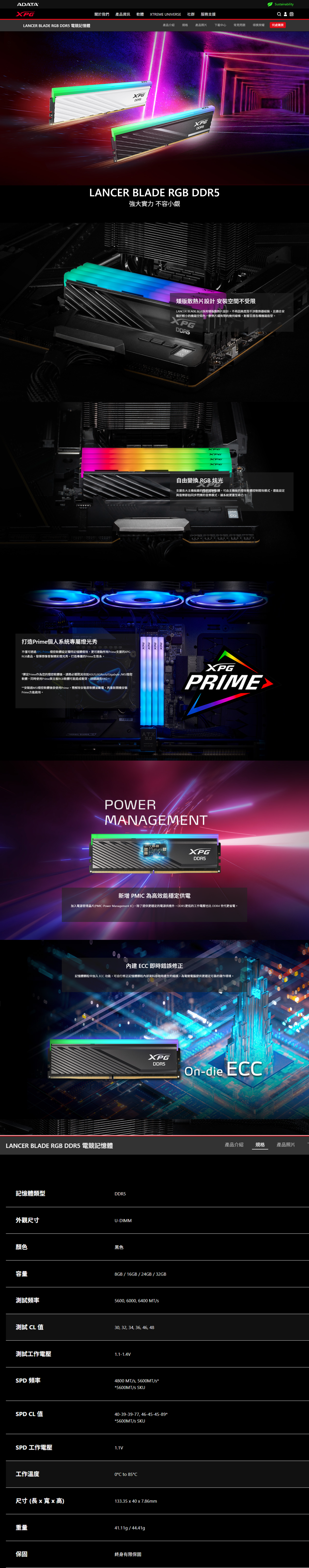 威剛 XPG LANCER BLADE RGB DDR5-6000 32G(16G*2) (矮版散熱片)-黑(CL36/支援XMP&EXPO)