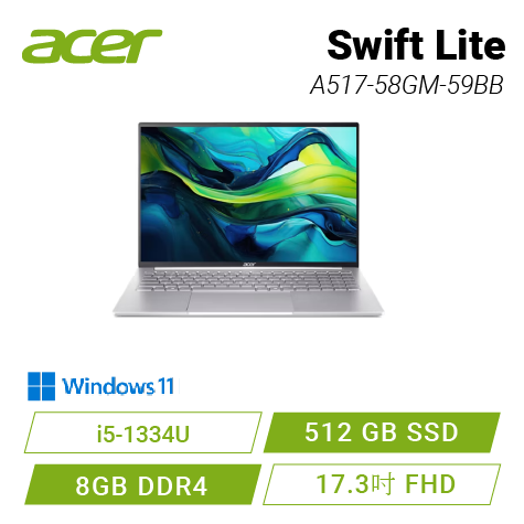 【原廠福利品】acer Aspire5 A517-58GM-59BB 金屬灰 宏碁13代強效戰鬥款筆電/i5-1355U/RTX2050/8GB DDR4/512GB PCIe/17.3吋 FHD/W11/不包含包包滑鼠