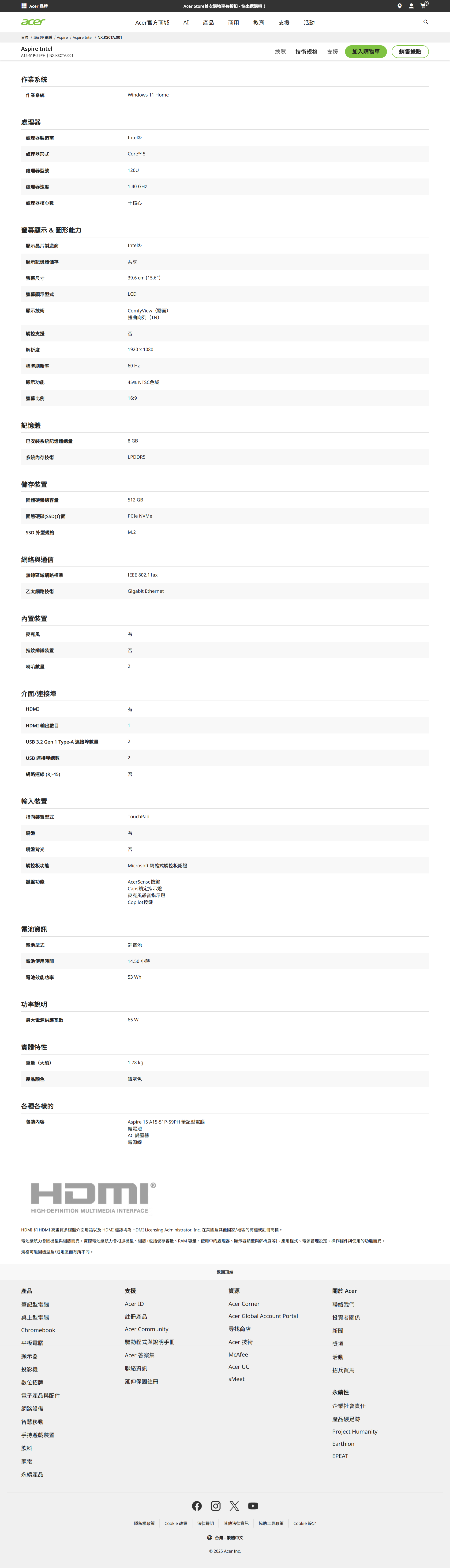 【原廠福利品】acer Aspire A15-51P-59PH 金屬灰 宏碁強效戰鬥款筆電/Intel® Core 5 120U/8GB DDR5/512GB PCIe/15.6吋 FHD/W11