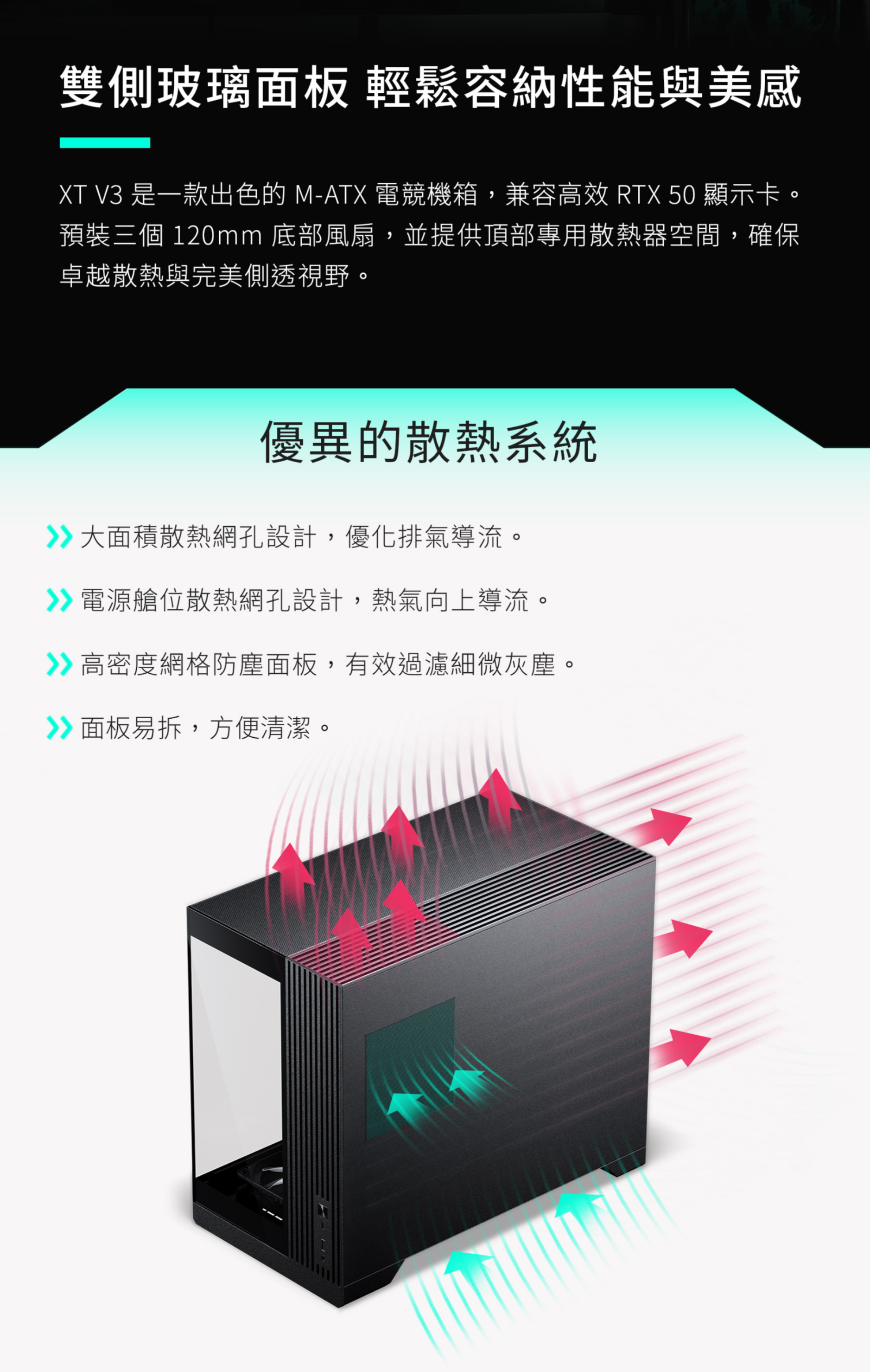 ▶電源艙位散熱網孔設計,熱氣向上導流。