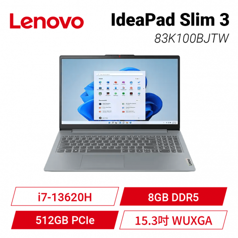Lenovo IdeaPad Slim 3 83K100BJTW 灰 高效能筆電/i7-13620H/8GB DDR5/512GB/W11/15.3吋 16:10 WUXGA/W11