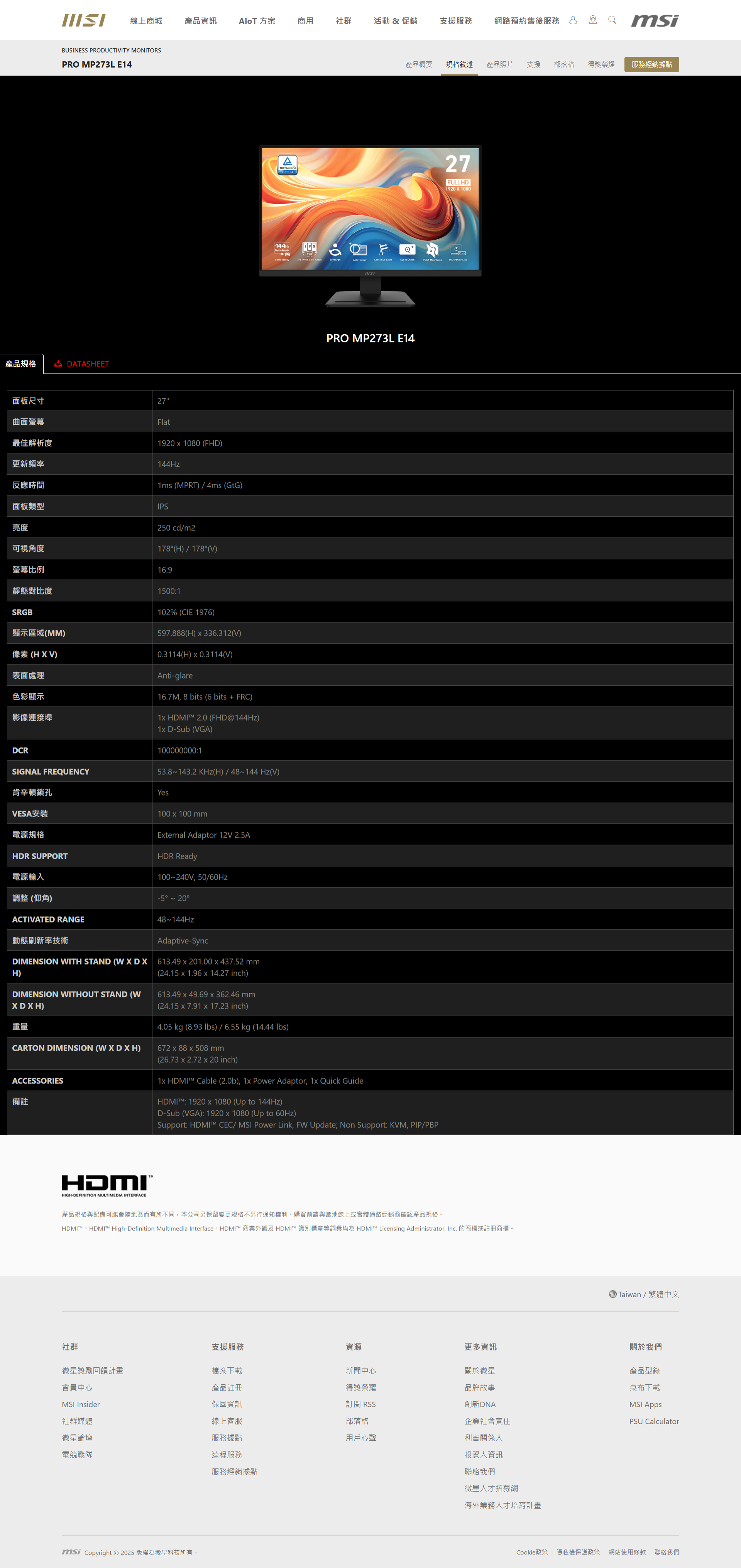 影像連接埠 1x HDMI™ 2.0 (FHD@144Hz)