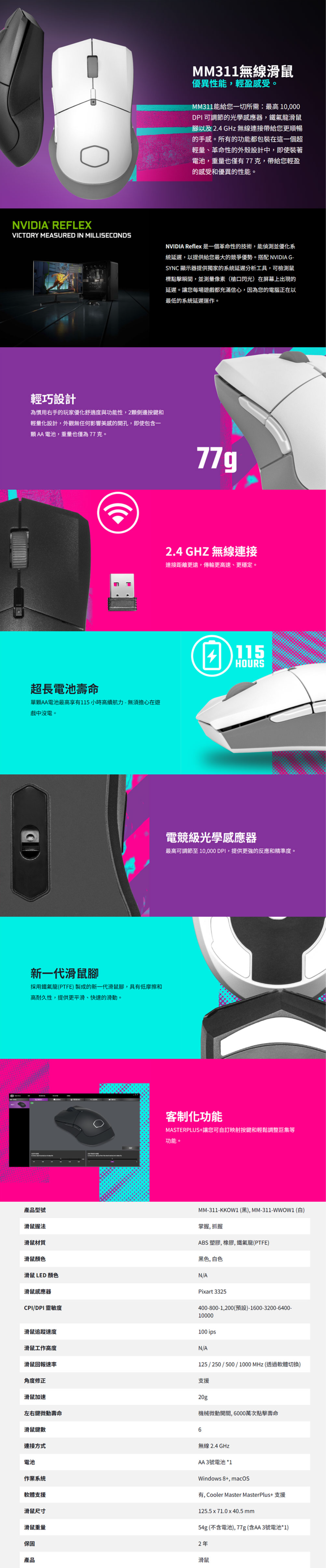 MM311能給您一切所需:最高 10,000 DPI 可調節的光學感應器,鐵氟龍滑鼠腳以及 2.4 GHz 無線連接帶給您更順暢的手感。所有的功能都包裝在這一個超輕量、革命性的外殼設計中,即使裝著電池,重量也僅有 77 克,帶給您輕盈的感受和優異的性能。