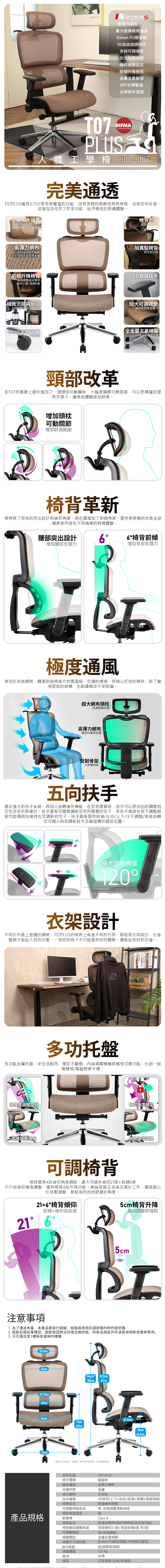 •高彈力台灣網布 •最大面積椅背通風 •65mm 耐用椅輪 •4D大面積扶手 •可調椅墊滑座 •後仰調整固定 •可調升降椅背 •金屬五星腳架 •MIT台灣製造