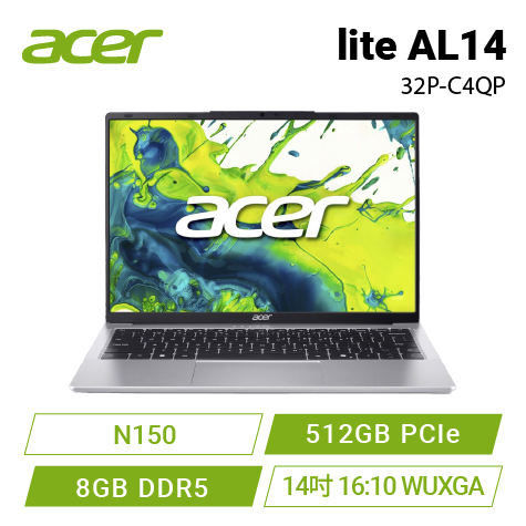 acer lite AL14-32P-C4QP 銀 宏碁高效能筆電/N150/8GB LPDDR5/512GB PCIe/14吋 16:10 FHD+/W11