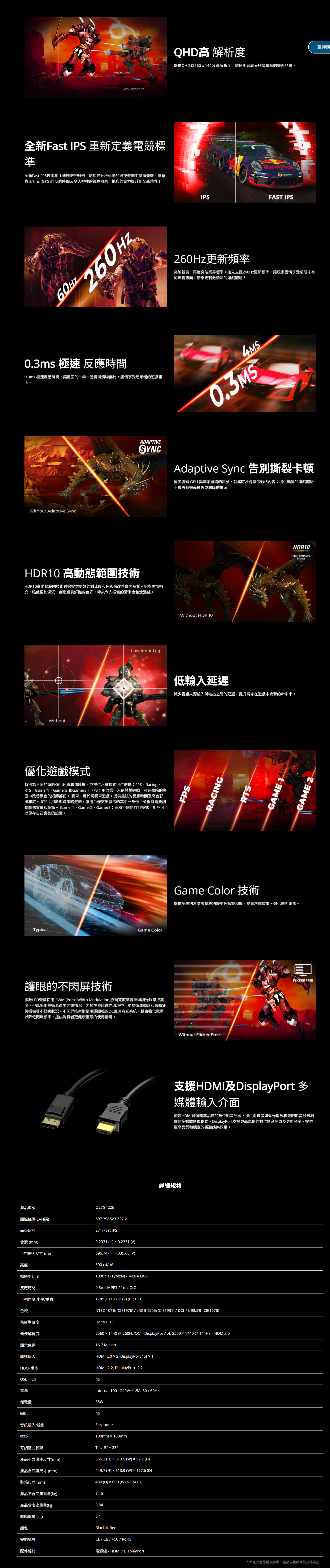 最佳解析度 2560 × 1440 @ 260Hz(OC) –DisplayPort1.4; 2560 × 1440 @ 144Hz – HDMI2.0