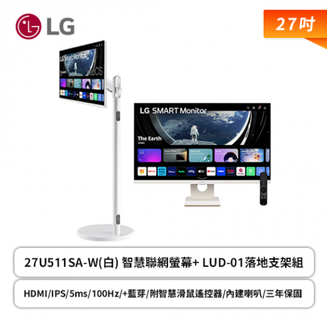 【27型】【落地支架組】 LG 27U511SA-W 白 智慧聯網螢幕 (HDMI/IPS/5ms/100Hz/HDR10/搭載webOS 24/支援WiFi+藍芽/附智慧滑鼠遙控器/內建喇叭/三年保固)+【 LUD-01 】 螢幕落地支架